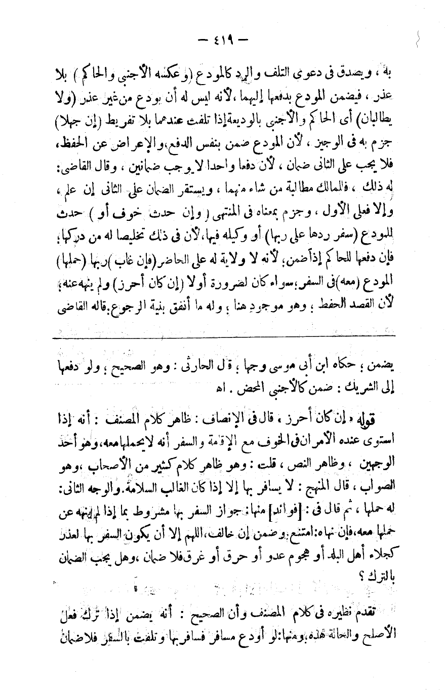به ويصدق في دعوى التلف والرد كالمودع ( وعكسه الأجنبي والحاكم ) بلا عذر فيضمن المودع بدفعها إليهما لأنه ليس له أن يودع من غير عذر ( ولا يطالبان ) أي الحاكم والأجنبي بالوديعة إذا تلفت عندهما بلا تفريط ( إن جهلا ) جزم به في الوجيز لأن المودع ضمن بنفس الدفع والإعراض عن الحفظ فلا يجب على الثاني ضمان لأن دفعا واحدا لا يوجب ضمانين وقال القاضي له ذلك فللمالك مطالبة من شاء منهما ويستقر الضمان على الثاني إن علم وإلا فعلى الأول وجزم بمعناه في المنتهى ( وإن حدث خوف أو ) حدث للمودع ( سفر ردها على ربها ) أو وكيله فيها لأن في ذلك تخليصا له من دركها فإن دفعها للحاكم إذن ضمن لأنه لا ولاية له على الحاضر ( فإن غاب ) ربها ( حملها ) المودع ( معه ) في السفر سواء كان لضرورة أو لا ( إن كان أحرز ) ولم ينهه عنه لأن القصد الحفظ وهو موجود هنا وله ما أنفق بنية الرجوع قاله القاضي