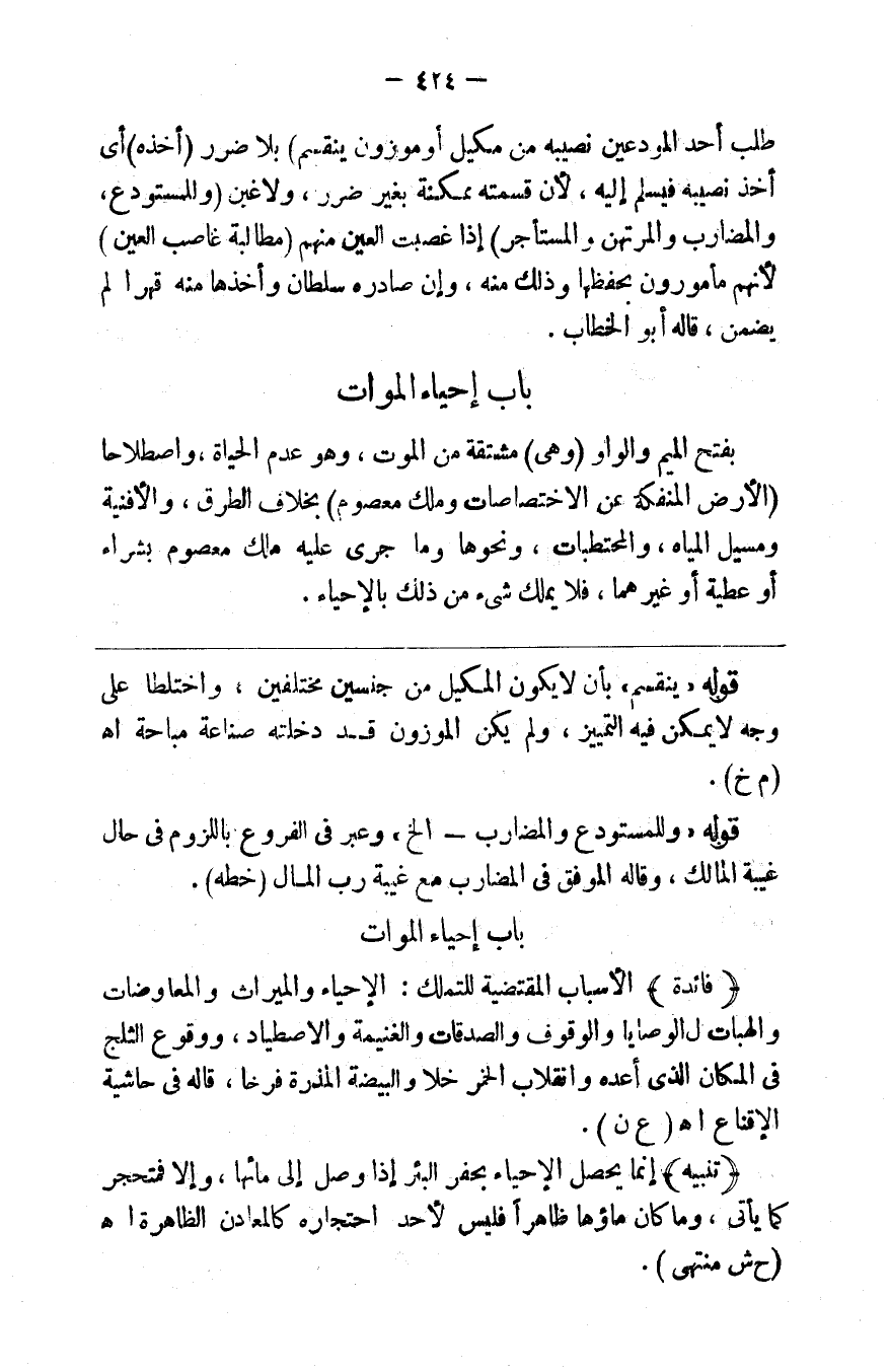 بفتح الميم والواو ( وهي ) مشتقة من الموت وهو عدم الحياة واصطلاحا ( الأرض المنفكة عن الاختصاصات وملك معصوم ) بخلاف الطرق والأقنية ومسيل المياه والمحتطبات ونحوها وما جرى عليه ملك معصوم بشراء أو عطية أو غيرهما فلا يملك شيئا من ذلك بالإحياء
