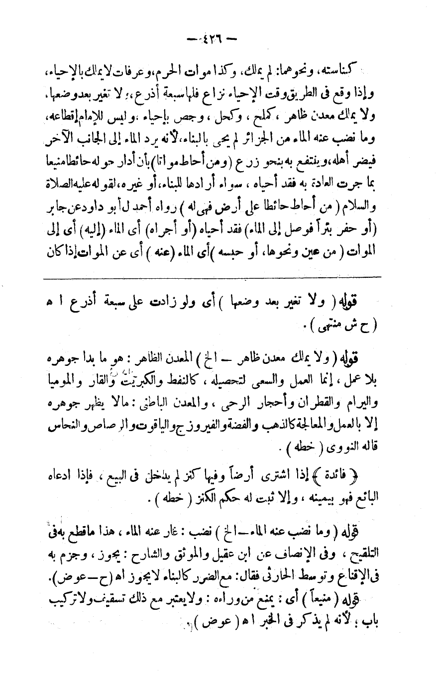 كناسة ونحوهما لم يملك وكذا موات الحرم وعرفات لايملك بالإحياء وإذا وقع في الطريق وقت الإحياء نزاع فلها سبعة أذرع ولا تغير بعد وضعها ولا يملك معدن ظاهر كملح وكحل وجص بإحياء وليس للإمام إقطاعه وما نصب عنه الماء من الجزائر لم يحي بالبناء لأنه يرد الماء إلى الجانب الأخر فيضر بأهله وينتفع به بنحو زرع ( ومن أحاط مواتا ) بأن أدار حوله حائطا منيعا بما جرت العادة به فقد أحياه سواء أرادها للبناء أو غيره لقوله صلى الله عليه وسلم من أحاط حائطا على أرض فهي له رواه أحمد وأبو داود عن جابر ( أو حفر بئرا فوصل إلى الماء ) فقد أحياه ( أو أجراه ) أي الماء ( إليه ) أي إلى الموات ( من عين ونحوها أو حبسه ) أي الماء ( عنه ) أي عن الموات إذا كان