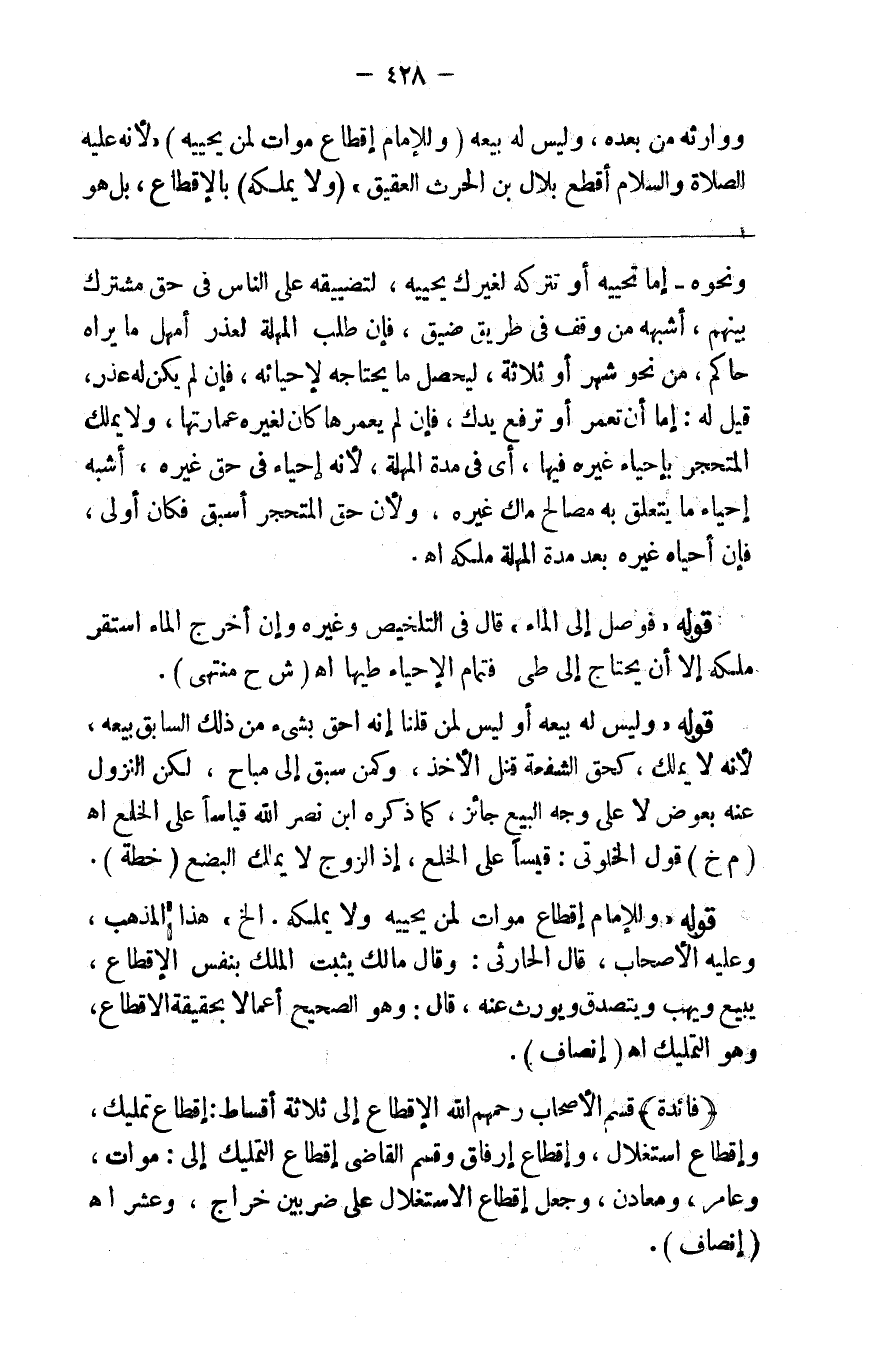 ووارثه من بعده وليس له بيعه ( وللإمام إقطاع موات لمن يحييه ) لأنه صلى الله عليه وسلم أقطع بلال بن الحارث العقيق ( ولا يملكه ) بالإقطاع بل هو