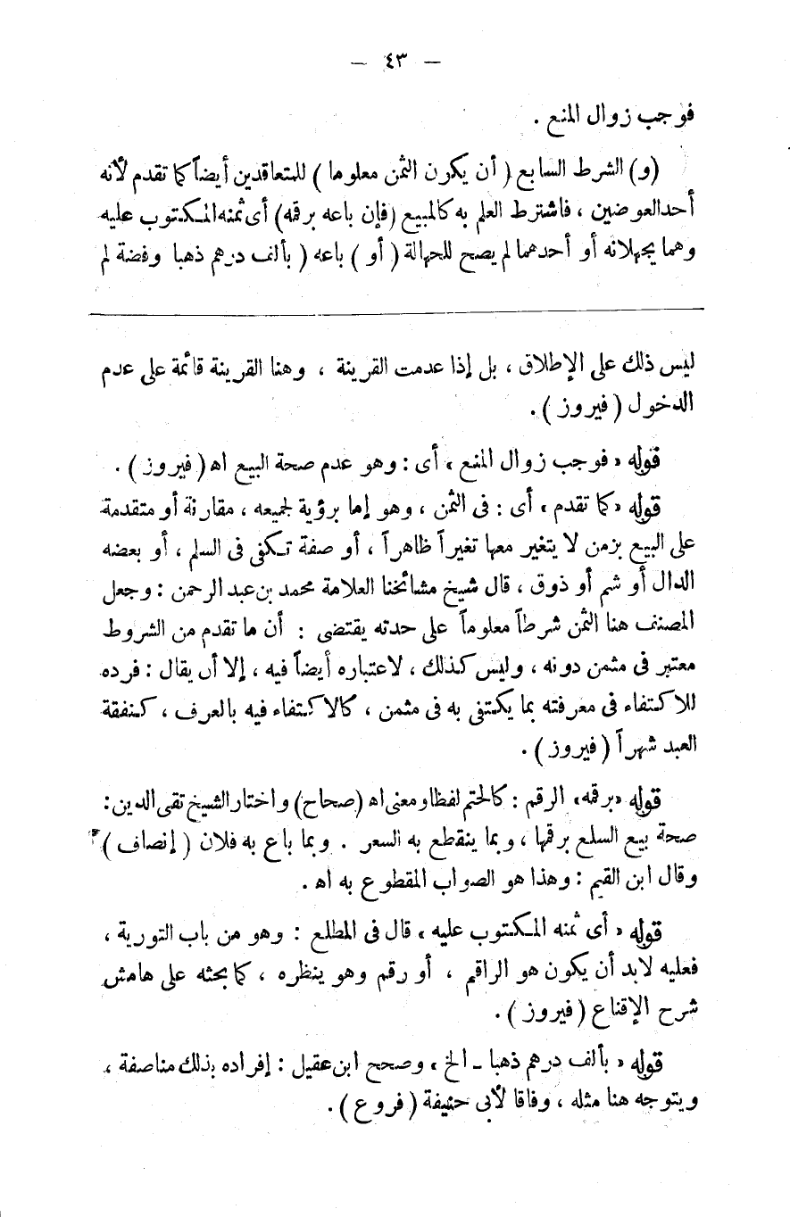 فوجب زوال المنع ( و ) الشرط السابع ( أن يكون الثمن معلوما ) للمتعاقدين أيضا كما تقدم لأنه أحد العوضين فاشترط العلم به كالمبيع ( فإن باعه برقمه ) أي ثمنه المكتوب عليه وهما يجهلانه أو أحدهما لم يصح للجهالة ( أو ) باعه ( بألف درهم ذهبا وفضة ) لم
