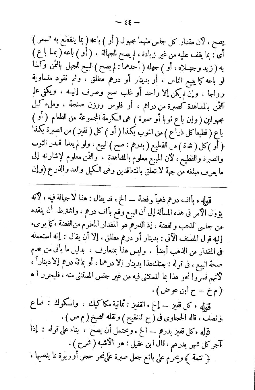 يصح لأن مقدار كل جنس منهما مجهول ( أو ) باعه ( بما ينقطع به السعر ) أي بما يقف عليه من غير زيادة لم يصح للجهالة ( أو ) باعه ( بما باع ) به ( زيد وجهلاه أو ) جهله ( أحدهما لم يصح البيع للجهل بالثمن ) وكذا لو باعه كما يبيع الناس أو بدينار أو درهم مطلق وثم نقود متساوية رواجا وإن لم يكن إلا واحدا أو غلب صح وصرف إليه ويكفي علم الثمن بالمشاهدة كصرة من دراهم أو فلوس ووزن صنجة وملء كيل مجهولين ( وإن باع ثوبا أو صبرة ) وهي الكومة المجموعة من الطعام ( أو ) باع ( قطيعا كل ذراع ) من الثوب بكذا ( أو ) كل ( قفيز ) من الصبرة بكذا ( أو ) كل ( شاة ) من القطيع ( بدرهم صح ) البيع ولو لم يعلما قدر الثوب والصبرة والقطيع لأن المبيع معلوم بالمشاهدة والثمن معلوم لإشارته إلى مايعرف مبلغه من جهة لا تتعلق بالمتعاقدين وهي الكيل والعد والذرع تفريق الصفقة ( وإن