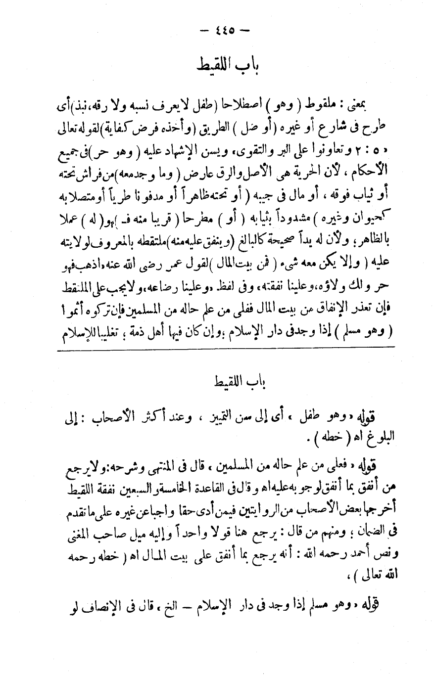 بمعنى ملقوط ( وهو ) اصطلاحا ( طفل لا يعرف نسبه ولا رقه نبذ ) أي طرح في شارع أو غيره ( أو ضل ) ( وأخذه فرض كفاية ) لقوله تعالى { وتعاونوا على البر والتقوى } ويسن الإشهاد عليه ( وهو حر ) في جميع الأحكام لأن الحرية هي الأصل والرق عارض ( وما وجد معه ) من فراش تحته أو ثياب فوقه أو مال في جيبه ( أو تحته ظاهرا أو مدفونا طريا أو متصلا به كحيوان أو غيره ) مشدودا بثيابه ( أو ) مطروحا ( قريبا منه ف ) هو ( له ) عملا بالظاهر ولأن له يدا صحيحة كالبالغ ( وينفق عليه منه ) ملتقطه بالمعروف لولايته عليه ( وإلا ) يكن معه شيء ( فمن بيت المال ) لقول عمر رضي الله عنه اذهب فهو حر ولك ولاؤه وعلينا نفقته وفي لفظ وعلينا رضاعه ولا يجب على الملتقط فإن تعذر الإنفاق من بيت المال فعلى من علم حاله من المسلمين فإن تركوه أثموا ( وهو مسلم ) إذا وجد في دار الإسلام وإن كان فيها أهل ذمة تغليبا لأهل الإسلام