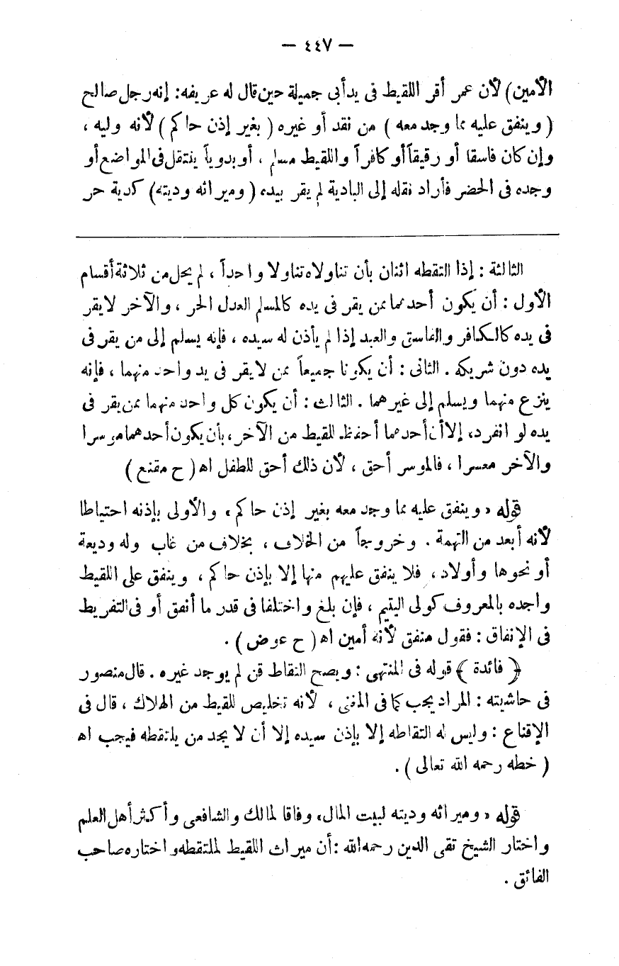 الأمين ) لأن عمر أقر اللقيط في يد أبي جميلة حين قال له عريفه إنه رجل صالح ( وينفق عليه ) مما وجد معه من نقد أو غيره ( بغير إذن حاكم ) لأنه وليه وإن كان فاسقا أو رقيقا أو كافرا واللقيط مسلم أو بدويا ينتقل في المواضع أو وجده في الحضر فأراد نقله إلى البادية لم يقر بيده ( وميراثه وديته ) كدية حر