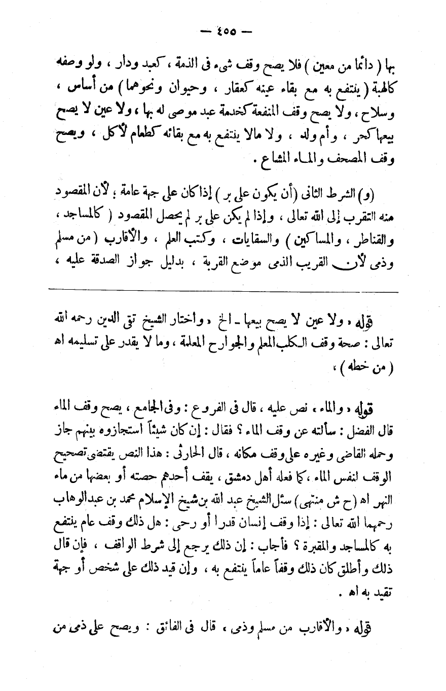 بها ( دائما من عين ) فلا يصح وقف شيء في الذمة كعبد ودار ولو وصفه كالهبة ( ينتفع به مع بقاء عينه ) كعقار وحيوان ونحوهما ) من أثاث وسلاح ولا يصح وقف المنفعة كخدمة عبد موصى له بها ولا عين لا يصح بيعها كحر وأم ولد ولا ما لا ينتفع به مع بقائه كطعام لأكل ويصح وقف المصحف والمال المشاع ( و ) الشرط الثاني ( أن يكون على بر ) إذا كان على جهة عامة لأن المقصود منه التقرب إلى الله تعالى وإذا لم يكن على بر لم يحصل المقصود ( كالمساجد والقناطر والمساكن ) والسقايات وكتب العلم ( والأقارب من مسلم وذمي ) لأن القريب الذمي موضع القرابة بدليل جواز الصدقة عليه
