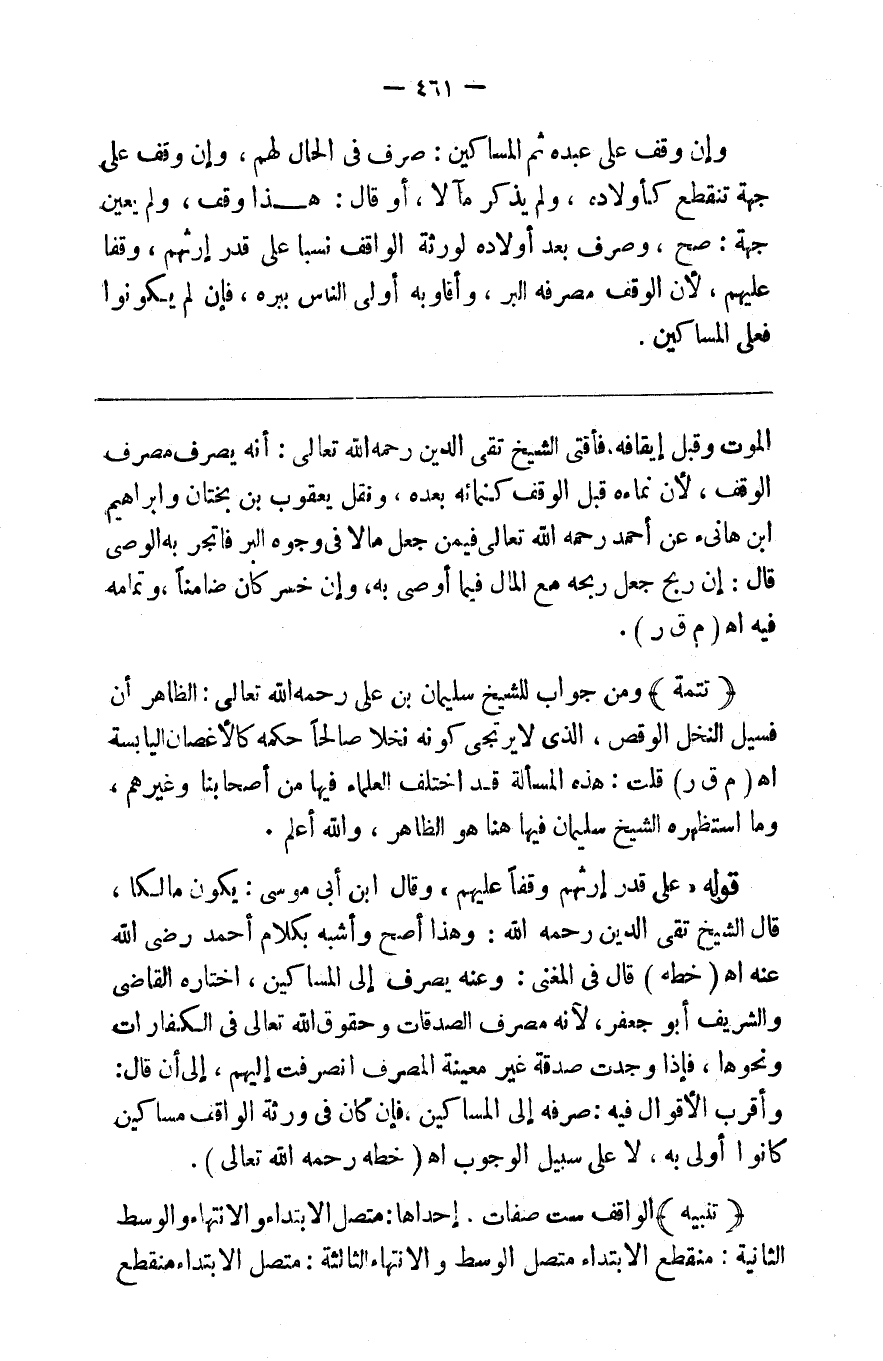 وإن وقف على عبده ثم المساكين صرف في الحال لهم وإن وقف على جهة تنقطع كأولاده ولم يذكر مآلا أو قال هذا وقف ولم يعين جهة صح وصرف بعد أولاده لورثة الواقف نسبا على قدر إرثهم وقفا عليهم لأن الوقف مصرفه البر وأقاربه أولى الناس ببره فإن لم يكونوا فعلى المساكين %