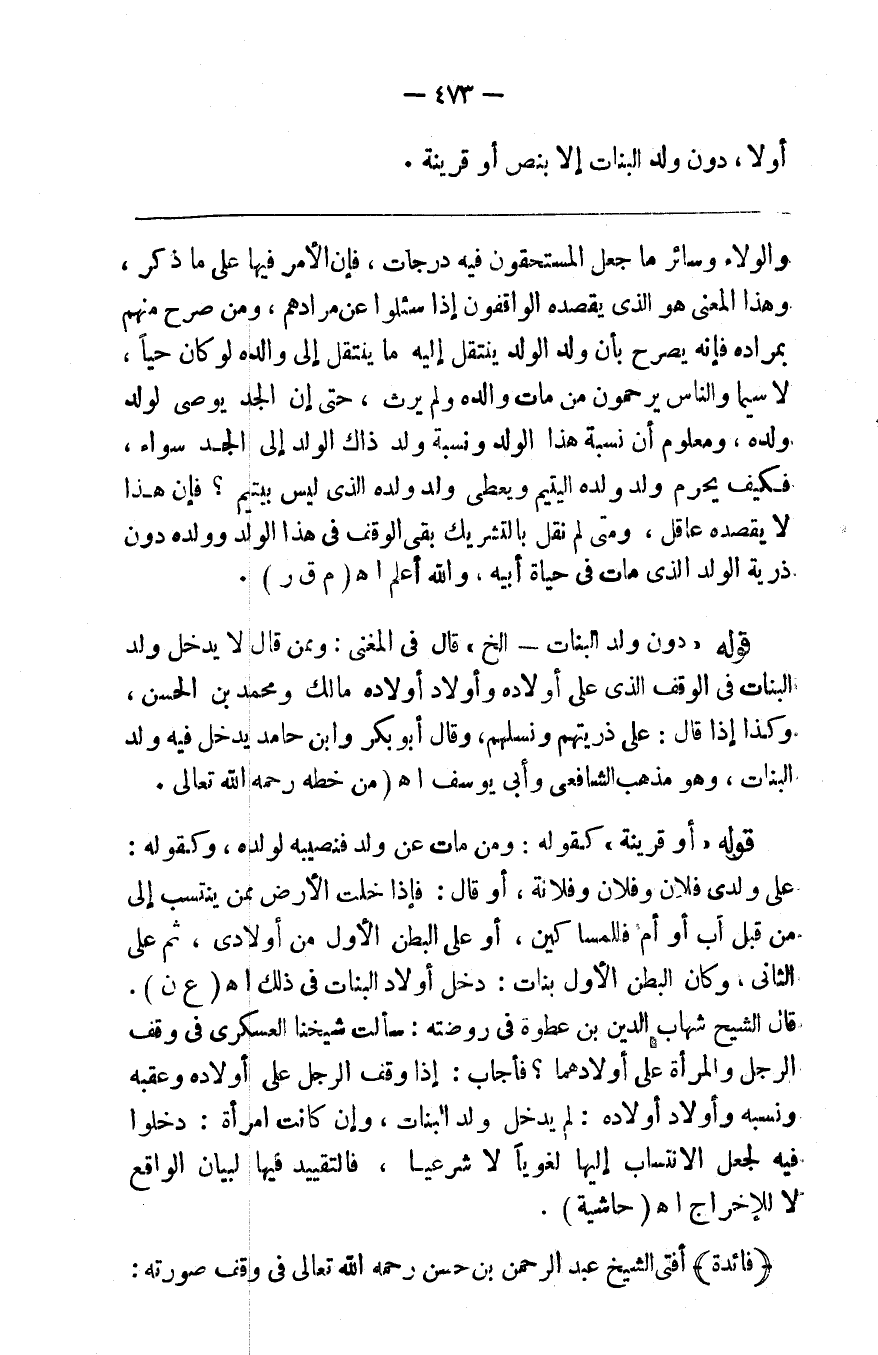 أو لا ( دون ) ولد ( بناته ) فلا يدخل ولد البنات في الوقف على الأولاد إلا بنص أو قرينة لعدم دخولهم في قوله تعالى { يوصيكم الله في أولادكم } كما لو قال على ولد ولده وذريته لصلبه أو عقبه أو نسله فيدخل