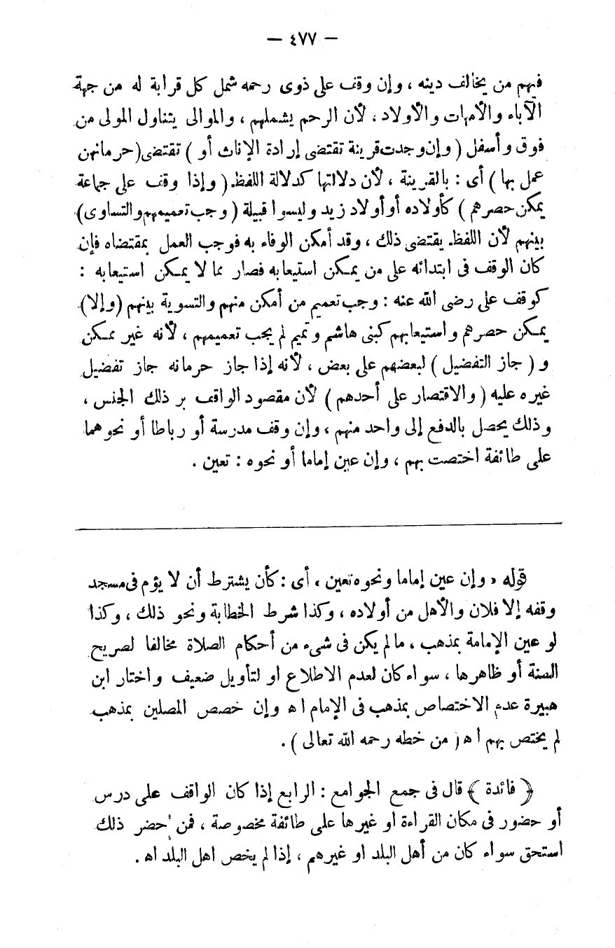فيهم من يخالف دينه وإن وقف على ذوي رحمه شمل كل قرابة له من جهة الآباء والأمهات والأولاد لأن الرحم يشملهم والموالي يتناول المولى من فوق وأسفل ( وإن وجدت قرينة تقتضي إرادة الأناث أو ) تقتضي ( حرمانهن عمل بها ) أي بالقرينة لأن دلالتها كدلالة اللفظ ( وإذا وقف على جماعة يمكن حصرهم ) كأولاده أو أولاد زيد وليسوا قبيلة ( وجب تعميمهم والتساوي ) بينهم لأن اللفظ يقتضي ذلك وقد أمكن الوفاء به فوجب العمل بمقتضاه فإن كان الوقف في ابتدائه على من يمكن استيعابه فصار مما لا يمكن استيعابه كوقف علي رضي الله عنه وجب تعميم من أمكن منهم والتساوي بينهم ( وإلا ) يمكن حصرهم واستيعابهم كبني هاشم وتميم لم يجب تعميمهم لأنه غير ممكن و ( جاز التفضيل ) لبعضهم على بعض لأنه إذا جاز حرمانه جاز تفضيل غيره عليه ( والاقتصار على أحدهم ) لأن المقصود الواقف بر ذلك الجنس وذلك يحصل بالدفع إلى واحد منهم وإن وقف مدرسة أو رباطا أو نحوهما على طائفة اختصت بهم وإن عين إماما أو نحوه تعين