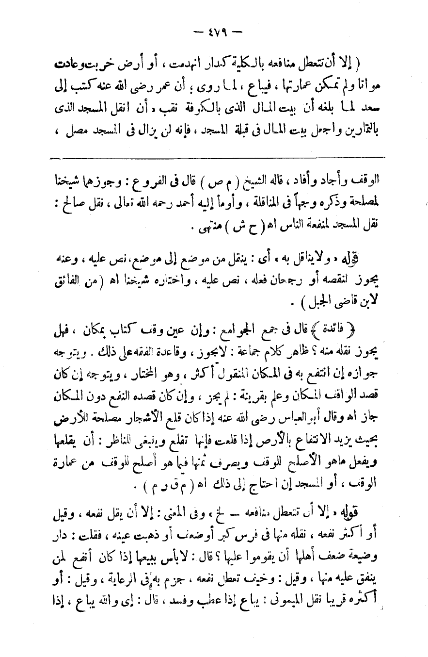 ( إلا أن تتعطل منافعه ) بالكلية كدار انهدمت أو أرض خربت وعادت مواتا ولم تمكن عمارتها فيباع لما روي أن عمر رضي الله عنه كتب إلى سعد لما بلغه أن بيت المال الذي بالكوفة نقب أن انقل المسجد الذي بالتمارين واجعل بيت المال في قبلة المسجد فإنه لن يزال في المسجد مصل