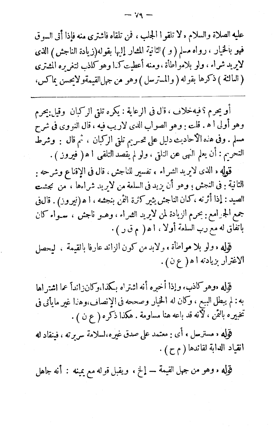 عليه الصلاة والسلام لاتلقوا الجلب فمن تلقاه فاشترى منه فإذا أتى ال فهو بالخيار رواه مسلم ( و ) الثانية المشار إليها بقوله ( بزيادة الناجش ) الذي لايريد شراء ولو بلا مواطأة ومنه أعطيت كذا وهو كاذب لتغريره المشتري الثالثة ذكرها بقوله ( والمسترسل ) وهو من جهل القيمة ولا يحسن يماكس