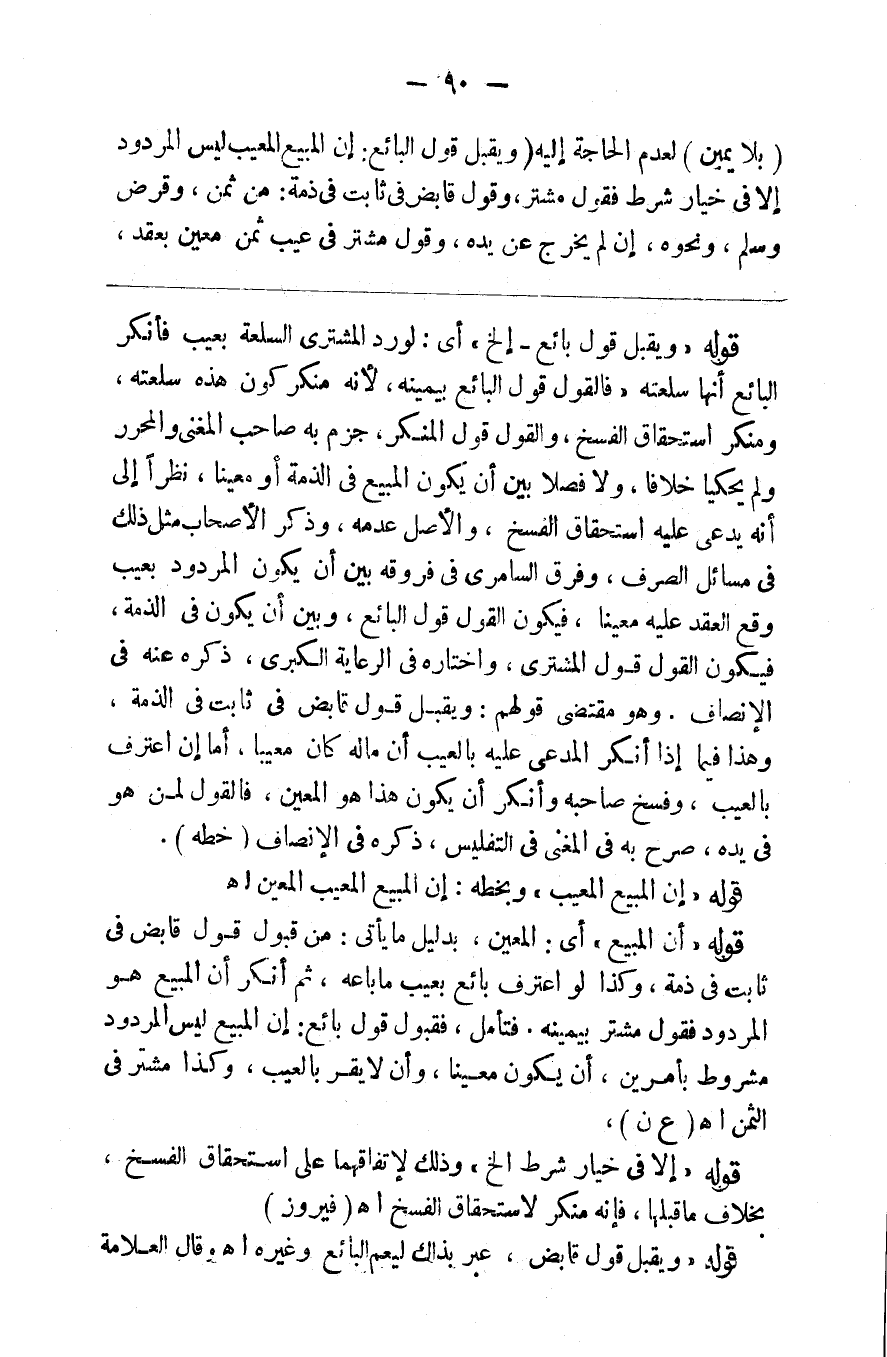 ( بلا يمين ) لعدم الحاجة إليه ويقبل قول البائع أن المبيع المعيب ليس المردود إلا في خيار شرط فقول مشتر وقول قابض في ثابت في ذمة من ثمن وقرض وسلم ونحوه إن لم يخرج عن يده وقول مشتر في عيب ثمن معين بعقد