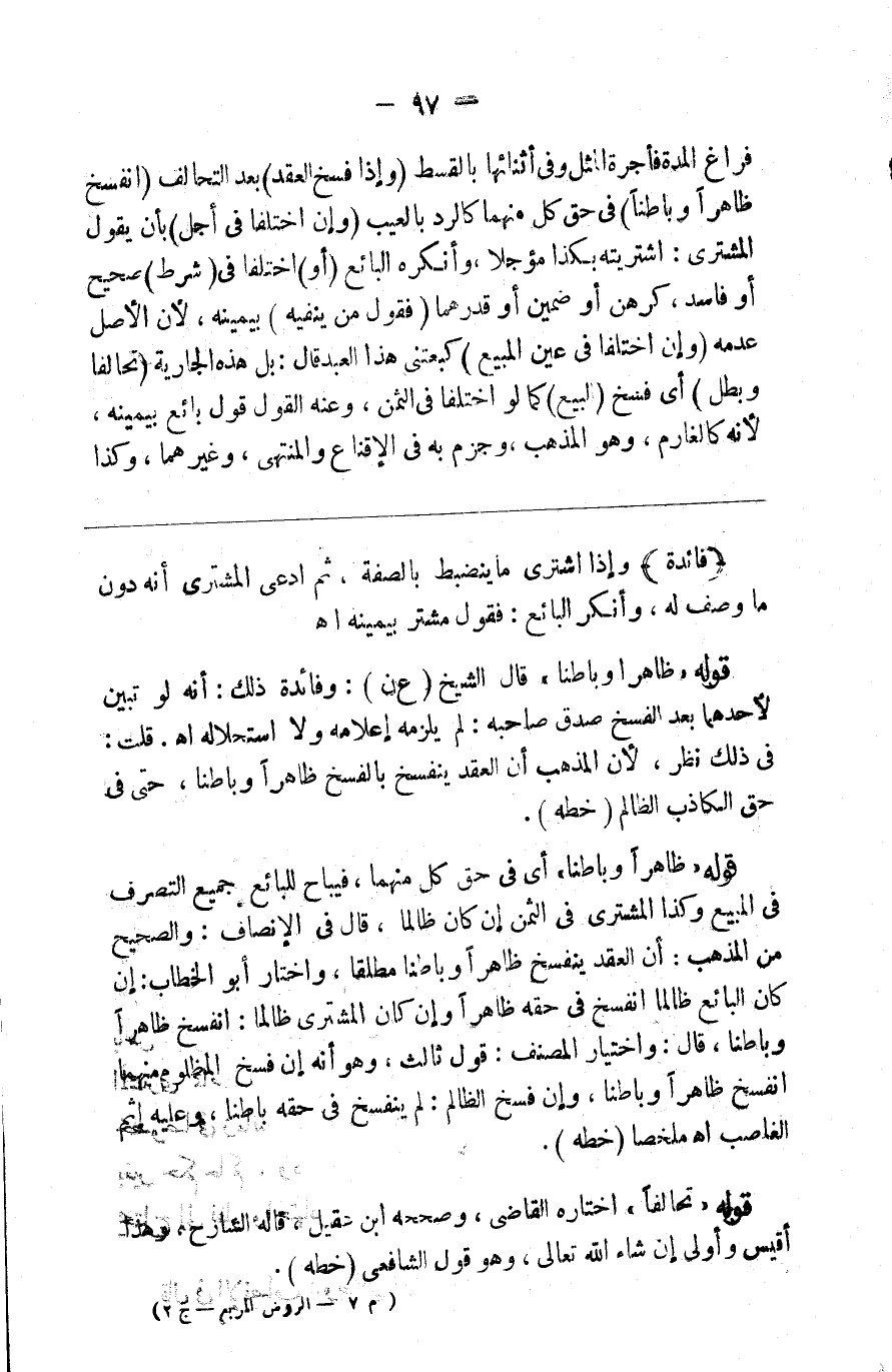 فراغ المدة فأجرة المثل وفي أثنائها بالقسط ( وإذا فسخ العقد ) بعد التحالف ( انفسخ ظاهرا وباطنا ) في حق كل منهما كالرد بالعيب ( وإن اختلفا في أجل ) بأن يقول المشتري اشتريته بكذا مؤجلا وأنكره البائع ( أو ) اختلفا في ( شرط ) صحيح أو فاسد كرهن أو ضمين أو قدرهما ( فقول من ينفيه ) بيمينه لأن الأصل عدمه ( وإن اختلفا في عين المبيع ) كبعتني هذا العبد قال بل هذه الجارية تحالفا وبطل أي فسخ ( البيع ) كما لو اختلفا في الثمن وعنه القول قول بائع بيمينه لأنه كالغارم وهو المذهب وجزم به في الإقناع و المنتهى وغيرهما وكذا