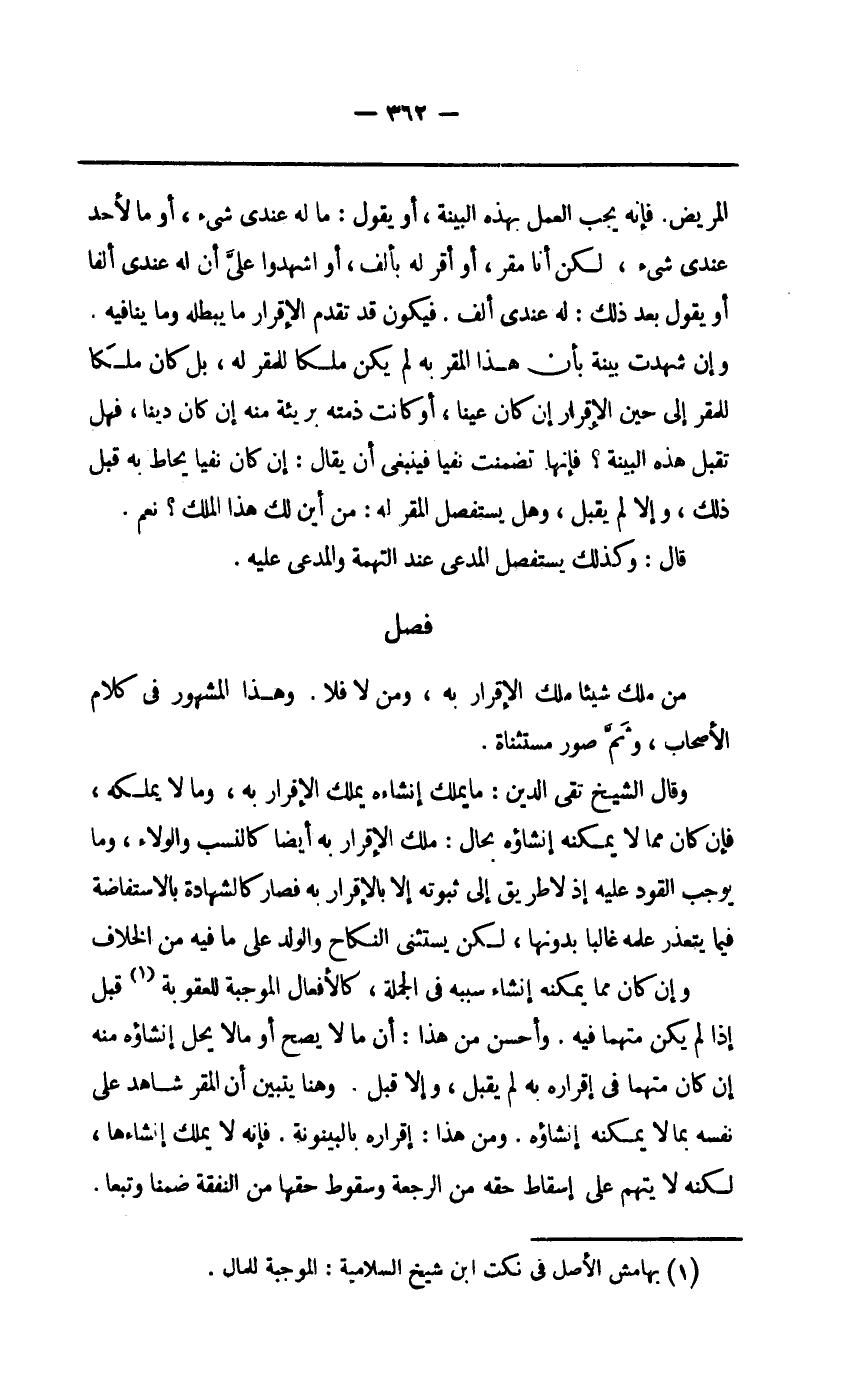 وَقَالَ الشَّيْخ تَقِيّ الدّين مَا يملك إنشاءه يملك الْإِقْرَار بِهِ وَمَا لَا يملكهُ فَإِن كَانَ مِمَّا لَا يُمكنهُ إنشاؤه بِحَال ملك الْإِقْرَار بِهِ أَيْضا كالنسب وَالْوَلَاء وَمَا يُوجب الْقود عَلَيْهِ إِذا لَا طَرِيق إِلَى ثُبُوته إِلَّا بِالْإِقْرَارِ بِهِ فَصَارَ كَالشَّهَادَةِ بالاستفاضة فِيمَا يتَعَذَّر علمه غَالِبا بِدُونِهَا لَكِن يسْتَثْنى النِّكَاح وَالْولد على مَا فِيهِ من الْخلاف