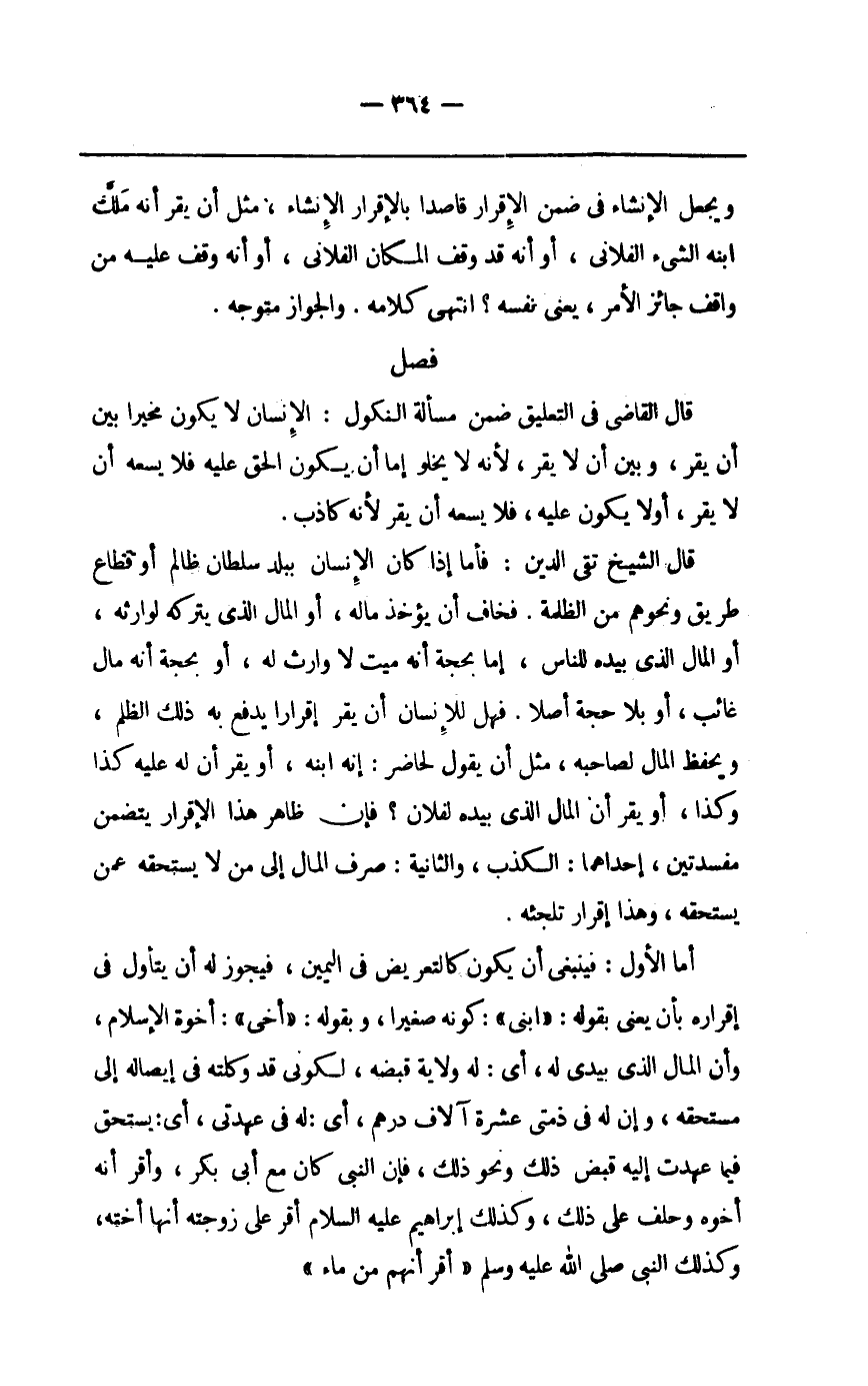 قَالَ الشَّيْخ تَقِيّ الدّين فَأَما إِذا كَانَ الْإِنْسَان بِبَلَد سُلْطَان ظَالِم أَو قطاع طَرِيق وَنَحْوهم من الظلمَة فخاف أَو يُؤْخَذ مَاله أَو المَال الَّذِي يتْركهُ لوَارِثه أَو المَال الَّذِي بِيَدِهِ للنَّاس إِمَّا بِحجَّة أَنه ميت لَا وَارِث لَهُ أَو بِحجَّة أَنه مَال غَائِب أَو بِلَا حجَّة أصلا فَهَل للْإنْسَان أَن يقر إِقْرَارا يدْفع بِهِ ذَلِك الظُّلم ويحتفظ المَال لصَاحبه مثل أَن يَقُول لحاضر إِنَّه ابْنه أَو يقر أَن لَهُ عَلَيْهِ كَذَا وَكَذَا أَو يقْرَأ أَن المَال الَّذِي بِيَدِهِ لفُلَان فَإِن ظَاهر هَذَا الْإِقْرَار يتَضَمَّن مفسدتين إِحْدَاهمَا الْكَذِب وَالثَّانيَِة صرف المَال إِلَى من لَا يسْتَحقّهُ عَمَّن يسْتَحقّهُ وَهَذَا إِقْرَار تلجئه