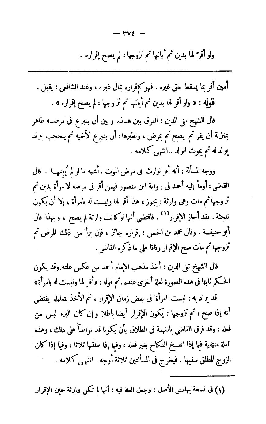 قَالَ الشَّيْخ تَقِيّ الدّين أَخذ مَذْهَب الإِمَام أَحْمد من عكس علته وَقد يكون الحكم ثَابتا فِي هَذِه الصُّورَة لعِلَّة أُخْرَى عِنْده ثمَّ قَوْله أقرّ لَهَا وَلَيْسَت لَهَا بأمرأة