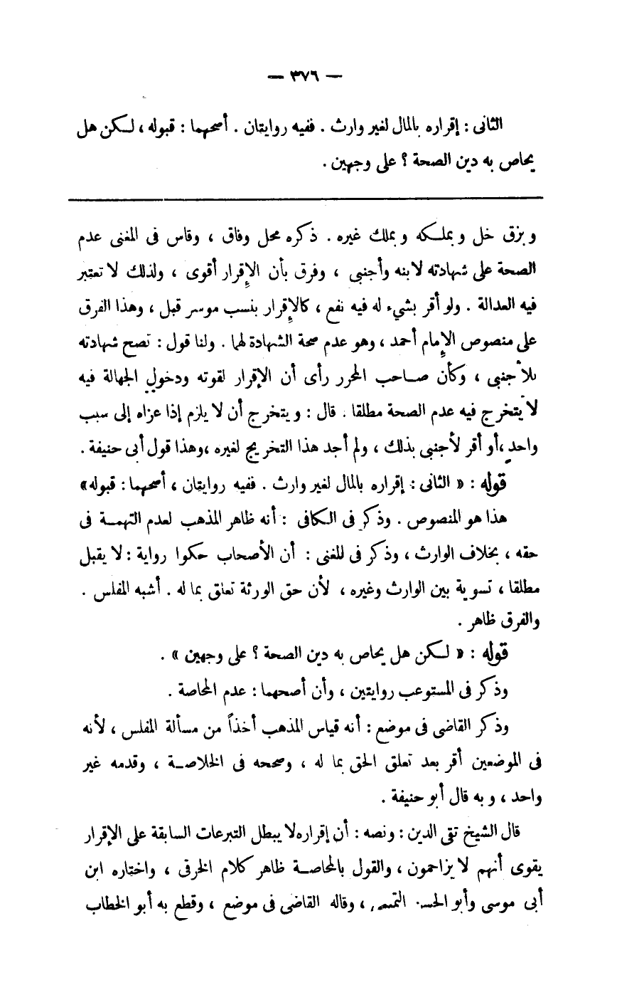 قَالَ الشَّيْخ تَقِيّ الدّين وَنَصه أَن إِقْرَار لَا يبطل التَّبَرُّعَات السَّابِقَة على الْإِقْرَار يُقَوي أَنهم لَا يزاحمون وَالْقَوْل بالمحاصة ظَاهر كَلَام الْخرقِيّ وَاخْتَارَهُ ابْن أبي مُوسَى وَأَبُو الْحسن التَّمِيمِي وَقَالَ القَاضِي فِي مَوضِع وَقطع بِهِ أَبُو الْخطاب