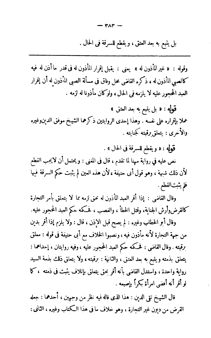 وَقَالَ أَبُو الْخطاب وَغَيره لم يَصح قبل الْإِذْن قَالَ وَلَا يلْزم إِذا أقرّ بدين من جِهَة التِّجَارَة لِأَنَّهُ مَأْذُون فِيهِ ونصبوا الْخلاف مَعَ أبي حنيفَة فِي قَوْله مُعَلّق بِرَقَبَتِهِ وَقَالَ القَاضِي فَحكمه حكم العَبْد الْمَحْجُور عَلَيْهِ وَفِي رِوَايَتَانِ إِحْدَاهمَا يتَعَلَّق بِذِمَّتِهِ وَيتبع بِهِ بعد الْعتْق وَالثَّانيَِة بِرَقَبَتِهِ وَلَا يتَعَلَّق ذَلِك بِذِمَّة السَّيِّد رِوَايَة وَاحِدَة وَاسْتدلَّ القَاضِي بِأَنَّهُ أقرّ بِحَق يتَعَلَّق بِإِتْلَاف يثبت فِي ذمَّته كَمَا لَو أقرّ أَنه أفْضى امْرَأَة بكرا بإصبعه