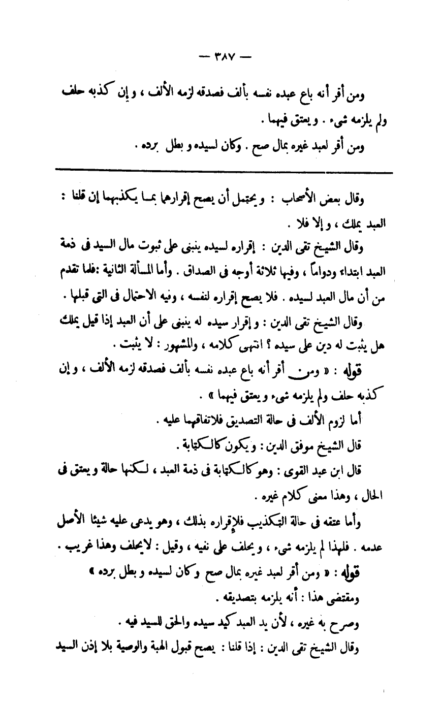 وَقَالَ الشَّيْخ تَقِيّ الدّين إِقْرَاره لسَيِّده ينبنى على ثُبُوت مَال السَّيِّد فِي ذمَّة العَبْد ابْتِدَاء ودواما وفيهَا ثَلَاثَة أوجه فِي الصَدَاق وَأما الْمَسْأَلَة الثَّانِيَة فَلَمَّا تقدم من أَن مَال العَبْد لسَيِّده فَلَا يَصح إِقْرَاره لنَفسِهِ وَفِيه الإحتمال فِي الَّتِي قبلهَا وَقَالَ الشَّيْخ تَقِيّ الدّين وَإِقْرَار سَيّده لَهُ يَنْبَنِي على أَن العَبْد إِذا قيل يملك هَل يثبت لَهُ دين على سَيّده انْتهى كَلَامه وَالْمَشْهُور لَا يثبت