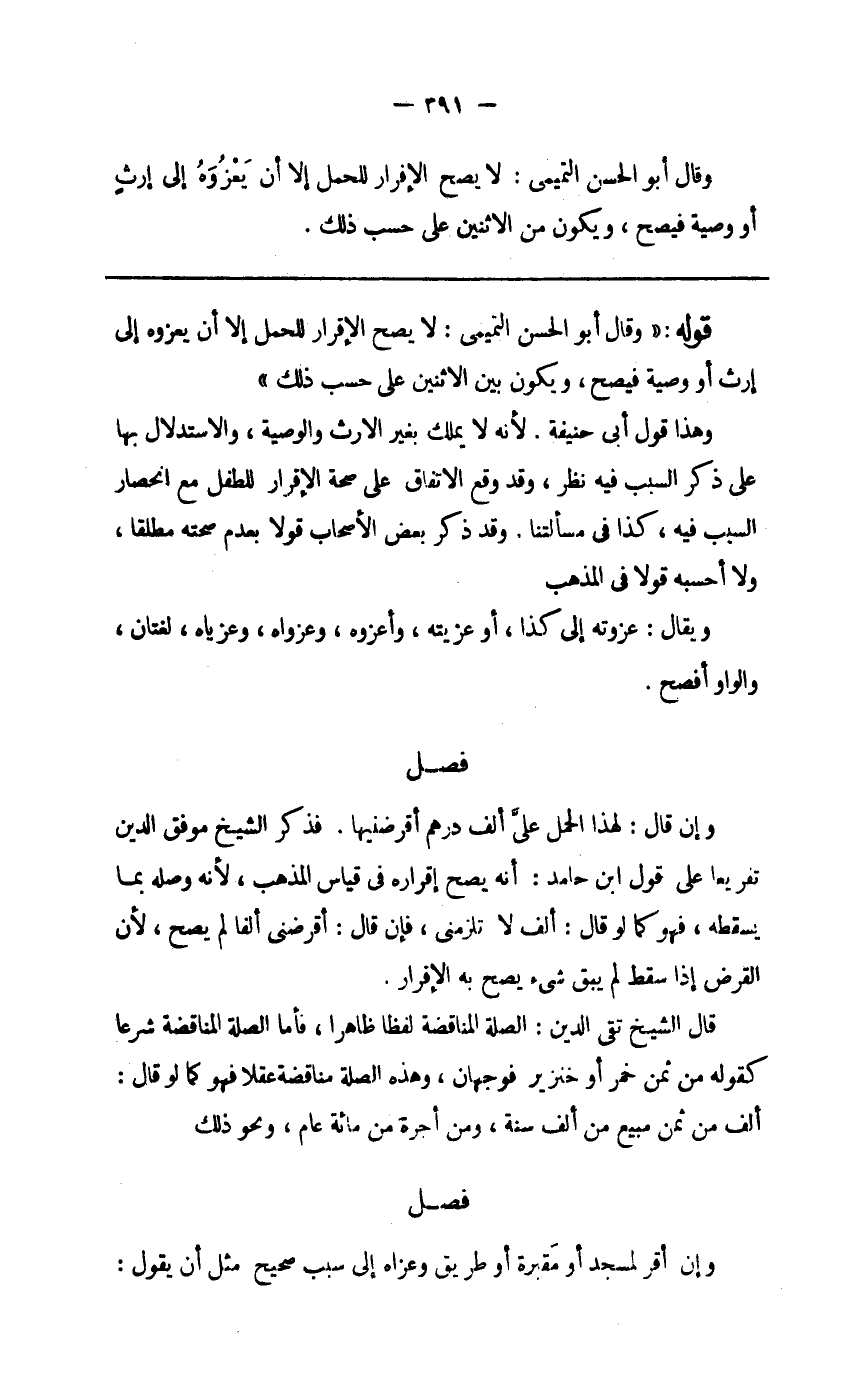 قَوْله وَقَالَ أَبُو الْحسن التَّمِيمِي لَا يَصح الْإِقْرَار للْحَمْل إِلَّا أَن يعزوه إِلَى إِرْث أَو وَصِيَّة فَيصح وَيكون بَين الِاثْنَيْنِ على حسب ذَلِك