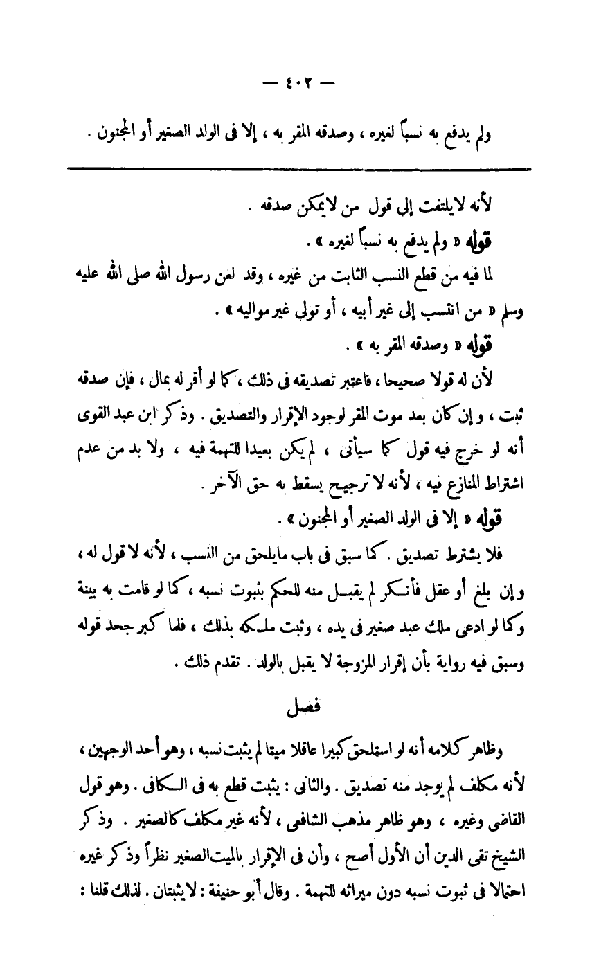 فَلَا يشْتَرط تَصْدِيق كَمَا سبق فِي بَاب مَا يلْحق من النّسَب لِأَنَّهُ لَا قَول لَهُ وَإِن بلغ أَو عقل فَأنْكر لم يقبل مِنْهُ للْحكم بِثُبُوت نسبه كَمَا لَو قَامَت بِهِ بَيِّنَة وكما لَو ادّعى ملك عبد صَغِير فِي يَده وَثَبت ملكه بذلك فَلَمَّا كبر جحد قَوْله وَسبق فِيهِ رِوَايَة بِأَن إِقْرَار الْمُزَوجَة لَا يقبل بِالْوَلَدِ تقدم ذَلِك