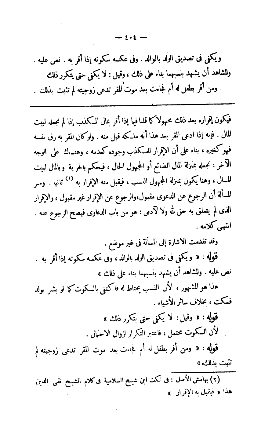 فَيكون إِقْرَاره بعد ذَلِك مَجْهُولا كَمَا قُلْنَا فِيمَا إِذا أقرّ بِمَال المكذب إِذا لم نجعله لبيت المَال فَإِنَّهُ إِذا ادّعى الْمقر بعد هَذَا أَنه ملكه قبل مِنْهُ وَلَو كَانَ الْمقر بِهِ رق نَفسه فَهُوَ كَغَيْرِهِ بِنَاء على أَن الْإِقْرَار للمكذب وجوده كَعَدَمِهِ وَهُنَاكَ على الْوَجْه الآخر نجعله بمنزله المَال الضائع أَو الْمَجْهُول الْحَال فَيحكم بِالْحُرِّيَّةِ وبالمال لبيت المَال وَهنا يكون بِمَنْزِلَة الْمَجْهُول النّسَب فَيقبل مِنْهُ الْإِقْرَار بِهِ ثَانِيًا وسر الْمَسْأَلَة أَن الرُّجُوع عَن الدَّعْوَى مَقْبُول وَالرُّجُوع عَن الْإِقْرَار غير مَقْبُول وَالْإِقْرَار الَّذِي لم يتَعَلَّق بِهِ حق لله وَلَا لآدَمِيّ هُوَ من بَاب الدعاوي فَيصح الرُّجُوع عَنهُ انْتهى كَلَامه