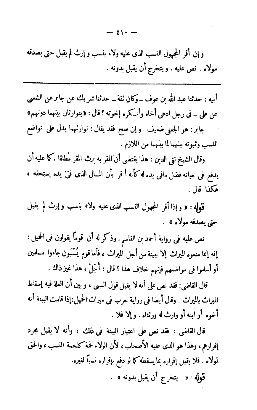 قَالَ القَاضِي فقد نَص على أَنه لَا يقبل قبُول السَّبي وَبَين أَن الْعلَّة فِيهِ إِسْقَاط الْمِيرَاث بِالْمِيرَاثِ وَقَالَ أَيْضا فِي رِوَايَة حَرْب من مِيرَاث الْحميل إِذا قَامَت الْبَيِّنَة أَنه أَخُوهُ أَو ابْنه أَو وَارِث لَهُ ورثتاه وَإِلَّا فَلَا