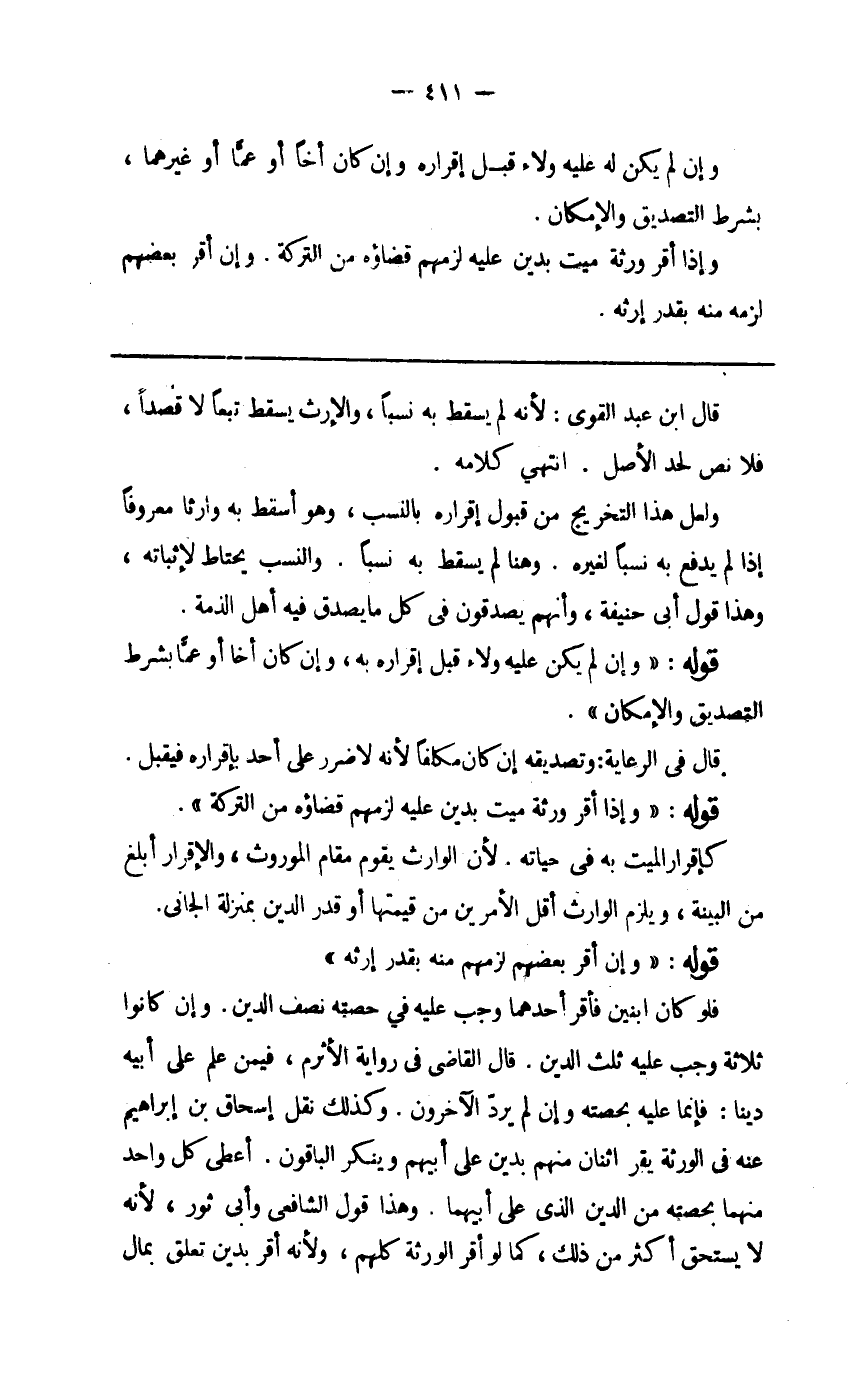 فَلَو كَانَ ابْنَيْنِ فَأقر أَحدهمَا وَجب عَلَيْهِ فِي حِصَّته نصف الدّين وَإِن كَانُوا ثَلَاثَة وَجب عَلَيْهِ ثلث الدّين قَالَ القَاضِي فِي رِوَايَة الْأَثْرَم فِيمَن علم على أَبِيه دينا فَإِنَّمَا عَلَيْهِ بِحِصَّتِهِ وَإِن لم يرد الْآخرُونَ وَكَذَلِكَ نقل إِسْحَاق بن إِبْرَاهِيم عَنهُ فِي الْوَرَثَة يقر اثْنَان مِنْهُم بدين على أَبِيهِم وينكر الْبَاقُونَ أعْطى كل وَاحِد مِنْهُمَا بِحِصَّتِهِ من الدّين الَّذِي على أَبِيهِمَا وَهَذَا قَول الشَّافِعِي وَأبي ثَوْر لِأَنَّهُ لَا يسْتَحق أَكثر من ذَلِك كَمَا لَو أقرّ الْوَرَثَة كلهم وَلِأَنَّهُ أقرّ بدين تعلق بِمَال