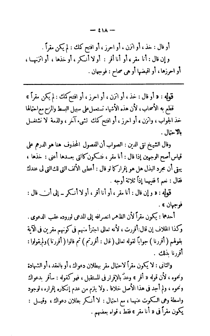 وَالثَّانِي لَا يكون مقرا لاحْتِمَال مقرّ بِبُطْلَان دعواك أَو بِالْعقدِ أَو الشَّهَادَة وَنَحْوه لِأَن قَوْله أقرّ وعد بِالْإِقْرَارِ فِي الْمُسْتَقْبل فَهُوَ كَقَوْلِه سأقر بدعواك وَنَحْوه وَلم أجد فِي هَذَا الأَصْل خلافًا وَلَا يلْزم من عدم إِنْكَاره إِقْرَاره لوُجُود وَاسِطَة وَهِي السُّكُوت عَنْهُمَا مَعَ احْتِمَال لَا أنكر بطلَان دعواك وَقيل يكون مقرا فِي أَنا مقرّ فَقَط قواه بَعضهم