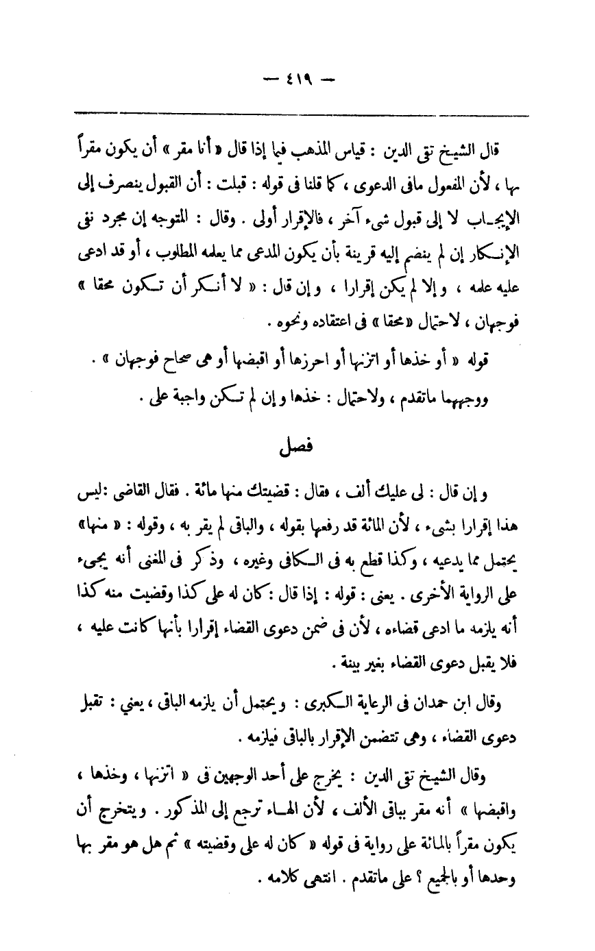 قَالَ الشَّيْخ تَقِيّ الدّين قِيَاس الْمَذْهَب فِيمَا إِذا قَالَ أَنا مقرّ أَن يكون مقرا بهَا لِأَن الْمَفْعُول مَا فِي الدَّعْوَى كَمَا قُلْنَا فِي قَوْله قبلت أَن الْقبُول ينْصَرف إِلَى الْإِيجَاب لَا إِلَى قبُول شَيْء آخر فالإقرار أولى وَقَالَ المتوجه إِن مُجَرّد نفي الْإِنْكَار إِن لم يَنْضَم إِلَيْهِ قرينَة بِأَن يكون الْمُدعى مِمَّا يُعلمهُ الْمَطْلُوب أَو قد ادّعى عَلَيْهِ علمه وَإِلَّا لم يكن إِقْرَار وَإِن قَالَ لَا أنكر أَن تكون محقا فَوَجْهَانِ لاحْتِمَال محقا فِي اعْتِقَاده وَنَحْوه
