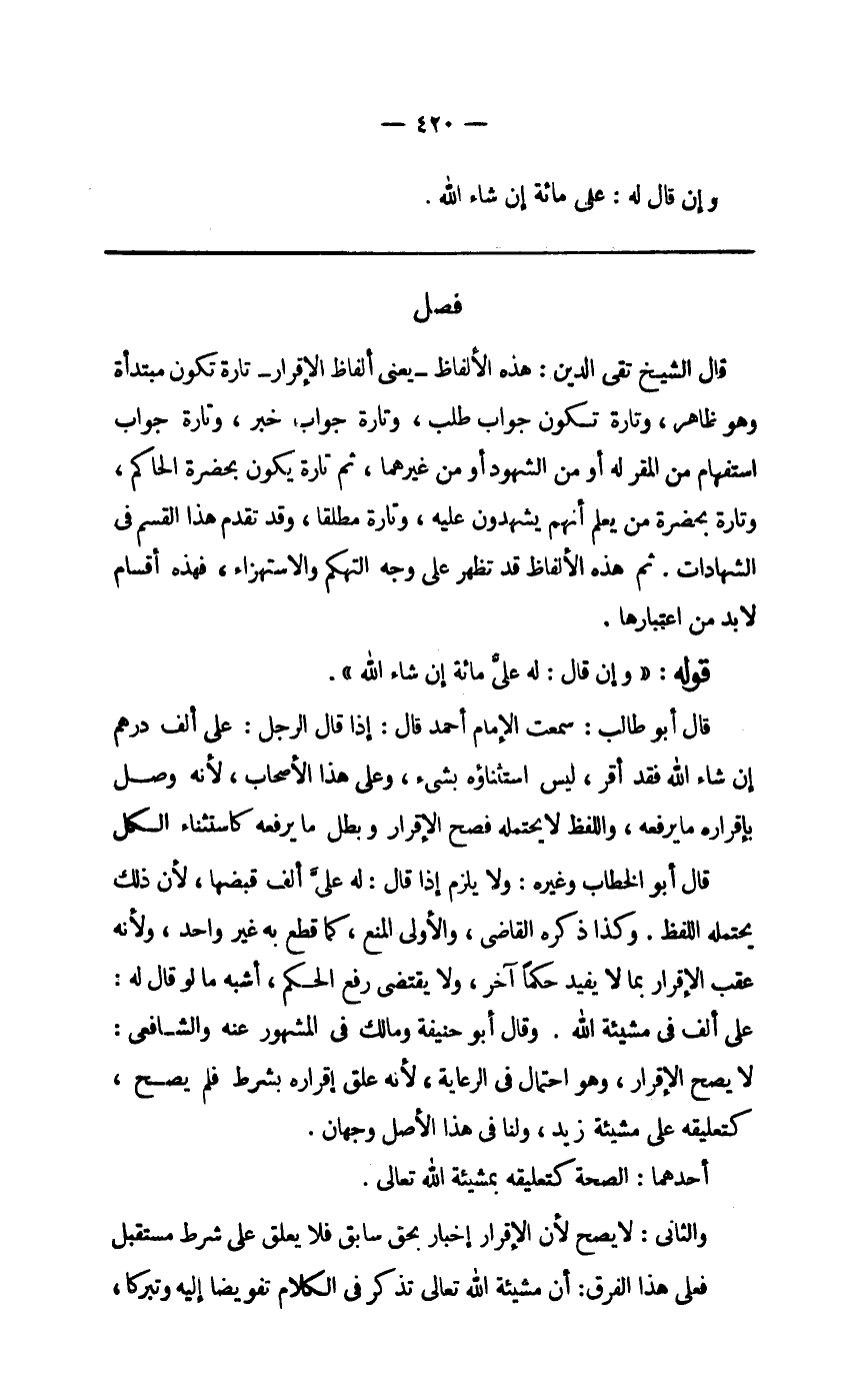 قَالَ أَبُو طَالب سَمِعت الإِمَام أَحْمد قَالَ إِذا قَالَ الرجل على ألف دِرْهَم إِن شَاءَ الله فقد أقرّ لَيْسَ اسْتِثْنَاؤُهُ بشئ وعَلى هَذَا الْأَصْحَاب لِأَنَّهُ وصل بِإِقْرَارِهِ مَا يرفعهُ وَاللَّفْظ لَا يحْتَملهُ فصح الْإِقْرَار وَبَطل مَا يرفعهُ كاستثناء الْكل