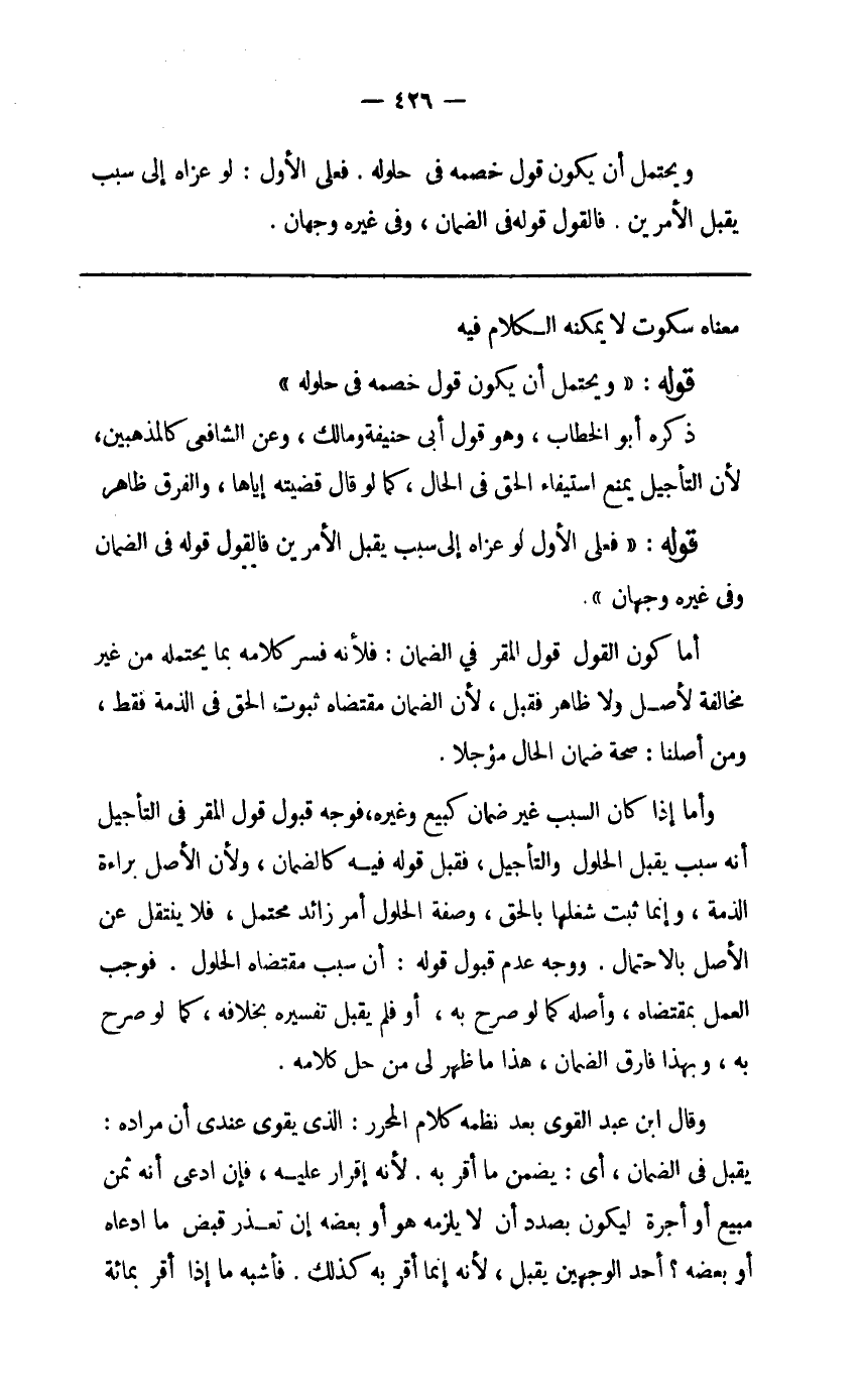 وَأما إِذا كَانَ السَّبَب غير ضَمَان كَبيع وَغَيره فَوجه قبُول قَول الْمقر فِي التَّأْجِيل أَنه سَبَب يقبل الْحُلُول والتأجيل فَقبل قَوْله فِيهِ كالضمان وَلِأَن الأَصْل بَرَاءَة الذِّمَّة وَإِنَّمَا ثَبت شغلها بِالْحَقِّ وَصفَة الْحُلُول أَمر زَائِد مُحْتَمل فَلَا ينْتَقل عَن الأَصْل بِالِاحْتِمَالِ وَوجه عدم قبُول قَوْله أَن سَبَب متقضاه الْحُلُول فَوَجَبَ الْعَمَل بِمُقْتَضَاهُ وَأَصله كَمَا لَو صرح بِهِ أَو فَلم يقبل تَفْسِيره بِخِلَافِهِ كَمَا لَو صرح بِهِ وَبِهَذَا فَارق الضَّمَان هَذَا مَا ظهر لي من حل كَلَامه