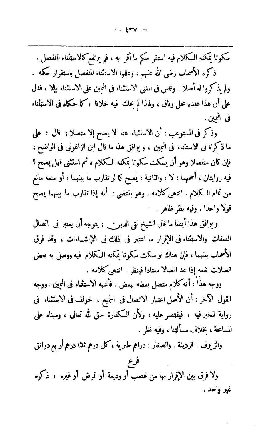 ذكره الْأَصْحَاب رَضِي الله عَنْهُم وعللوا الِاسْتِثْنَاء الْمُنْفَصِل باستقرار حكمه وَلم يذكرُوا لَهُ أصلا وقاس فِي الْمُغنِي الِاسْتِثْنَاء فِي الْيَمين بإلا فَدلَّ على أَن هَذَا عِنْده مَحل وفَاق وَلِهَذَا لم يحك فِيهِ خلافًا كَمَا حَكَاهُ فِي الِاسْتِثْنَاء فِي الْيَمين