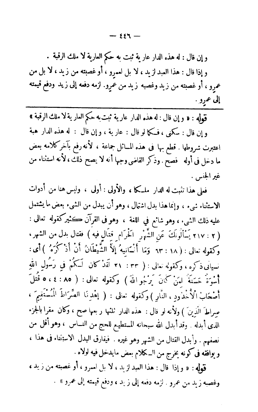 فعلى هَذَا تثبت لَهُ الدَّار ملكا وَالْأولَى وَلَيْسَ هُنَا من أدوات الِاسْتِثْنَاء شَيْء وَإِنَّمَا هَذَا بدل اشْتِمَال وَهُوَ أَن يُبدل من الشَّيْء بعض مَا يشْتَمل عَلَيْهِ ذَلِك الشَّيْء وَهُوَ شَائِع فِي اللُّغَة وَهُوَ فِي الْقُرْآن كثير كَقَوْلِه تَعَالَى {يَسْأَلُونَك عَن الشَّهْر الْحَرَام قتال فِيهِ} فقتال بدل من الشَّهْر وَكَقَوْلِه تَعَالَى {وَمَا أنسانيه إِلَّا الشَّيْطَان أَن أذكرهُ} أَي نسياني ذكره وَكَقَوْلِه تَعَالَى {لقد كَانَ لكم فِي رَسُول الله أُسْوَة حَسَنَة لمن كَانَ يَرْجُو الله} وَكَقَوْلِه تَعَالَى {قتل أَصْحَاب الْأُخْدُود النَّار} وَكَقَوْلِه تَعَالَى {اهدنا الصِّرَاط الْمُسْتَقيم صِرَاط الَّذين} وَلِأَنَّهُ لَو قَالَ هَذِه الدَّار ثلثهَا ربعهَا صَحَّ وَكَانَ مقرّ بالجزء الَّذِي أبدله وَقد أبدل الله سُبْحَانَهُ المستطيع لِلْحَجِّ من النَّاس وَهُوَ أقل من نصفهم وأبدل الْقِتَال من الشَّهْر وَهُوَ غَيره فيفارق الْبَدَل الِاسْتِثْنَاء فِي هَذَا وَيُوَافِقهُ فِي كَونه يخرج من الْكَلَام بعض مَا يدْخل فِيهِ لولاه