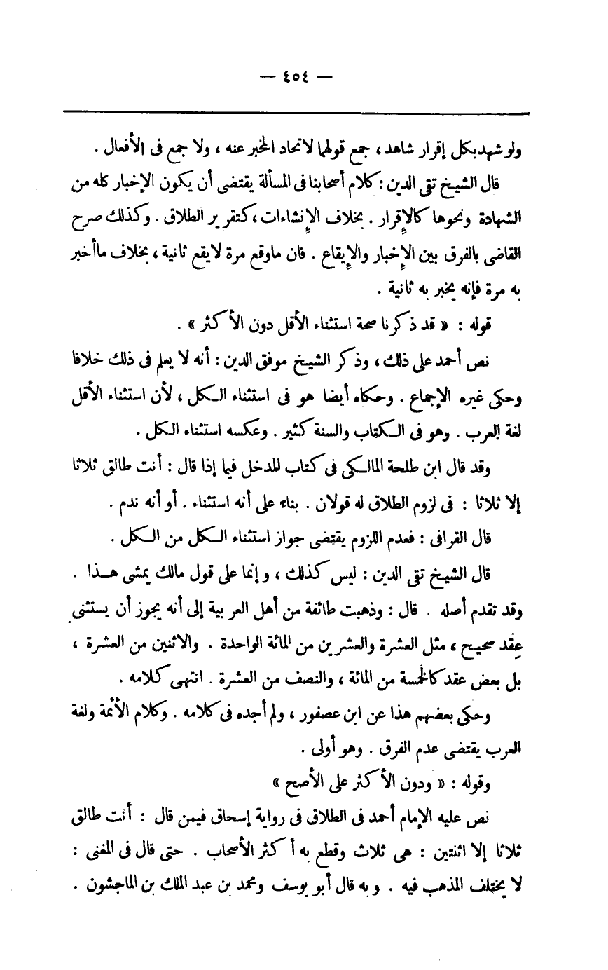 نَص عَلَيْهِ الإِمَام أَحْمد فِي الطَّلَاق فِي رِوَايَة إِسْحَاق فِيمَن قَالَ أَنْت طَالِق ثَلَاثًا إِلَّا اثْنَتَيْنِ هِيَ ثَلَاث وَقطع بِهِ أَكثر الْأَصْحَاب حَتَّى قَالَ فِي المغنى لَا يخْتَلف الْمَذْهَب فِيهِ وَبِه قَالَ أَبُو يُوسُف وَمُحَمّد بن الْملك بن الْمَاجشون