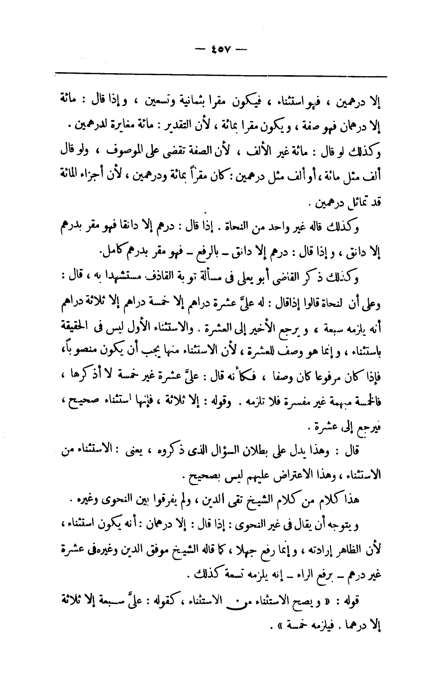 وَكَذَلِكَ ذكر القَاضِي أَبُو يعلى فِي مَسْأَلَة تَوْبَة الْقَاذِف مستشهدا بِهِ قَالَ وعَلى أَن النُّحَاة قَالُوا إِذا قَالَ لَهُ عَليّ عشرَة دَرَاهِم إِلَّا خَمْسَة دَرَاهِم إِلَّا ثَلَاثَة دَرَاهِم أَنه يلْزمه سَبْعَة وَيرجع الْأَخير إِلَى الْعشْرَة وَالِاسْتِثْنَاء الأول لَيْسَ فِي الْحَقِيقَة باستثناء وَإِنَّمَا هُوَ وصف للعشرة لِأَن الِاسْتِثْنَاء مِنْهَا يجب أَن يكون مَنْصُوبًا فَإِذا كَانَ مَرْفُوعا كَانَ وَصفا فَكَأَنَّهُ قَالَ عَليّ عشرَة غير خَمْسَة لَا أذكرها فالخمسة مُبْهمَة غير مفسرة فَلَا تلْزمهُ وَقَوله إِلَّا ثَلَاثَة فَإِنَّهَا اسْتثِْنَاء صَحِيح فَيرجع إِلَى عشرَة