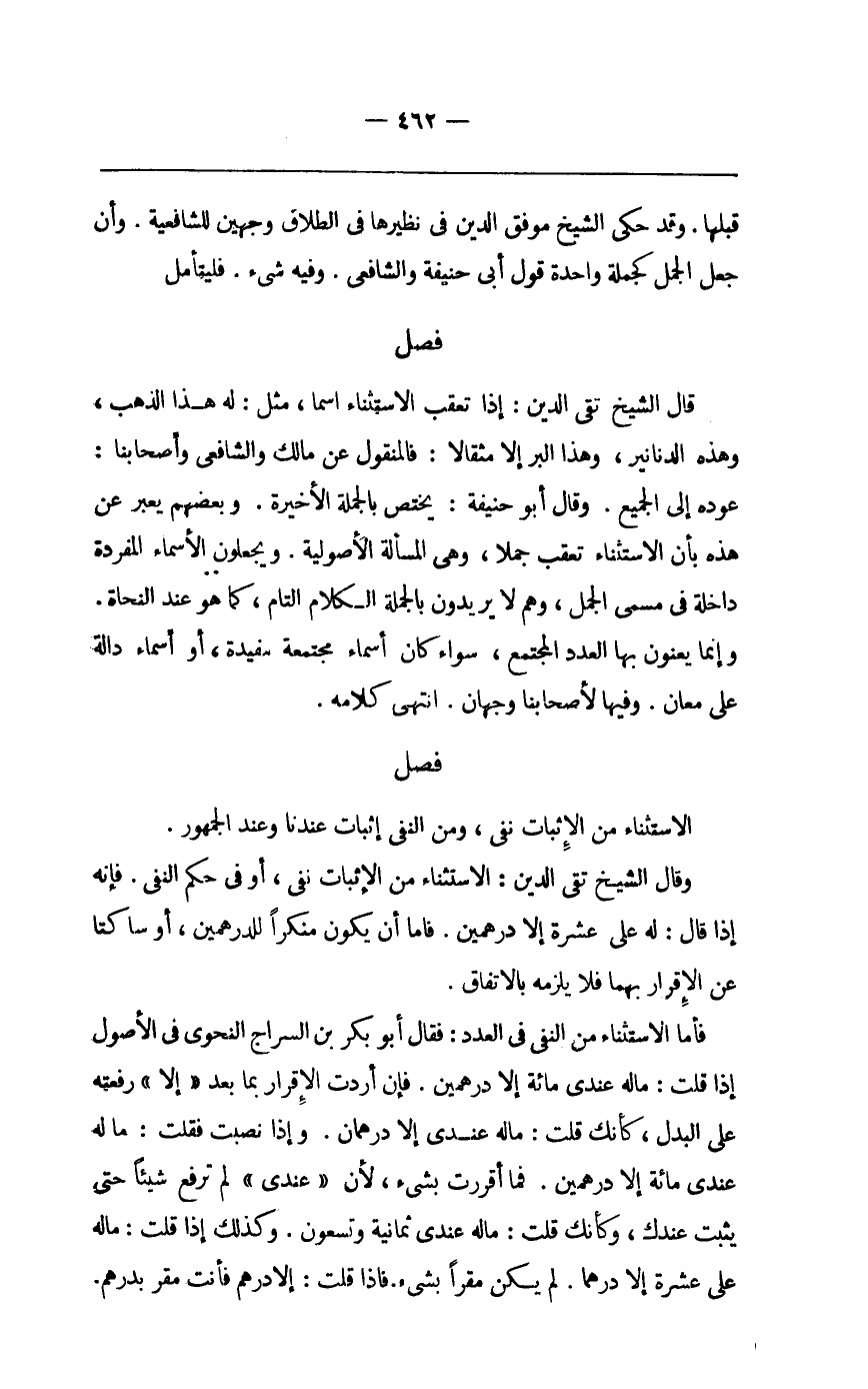 وَقَالَ الشَّيْخ تَقِيّ الدّين الِاسْتِثْنَاء من الْإِثْبَات نفي أَو فِي حكم النَّفْي فَإِنَّهُ إِذا قَالَ لَهُ عَليّ عشرَة إِلَّا دِرْهَمَيْنِ فإمَّا أَن يكون مُنْكرا للدرهمين أَو ساكتا عَن الْإِقْرَار بهما فَلَا يلْزمه بالِاتِّفَاقِ