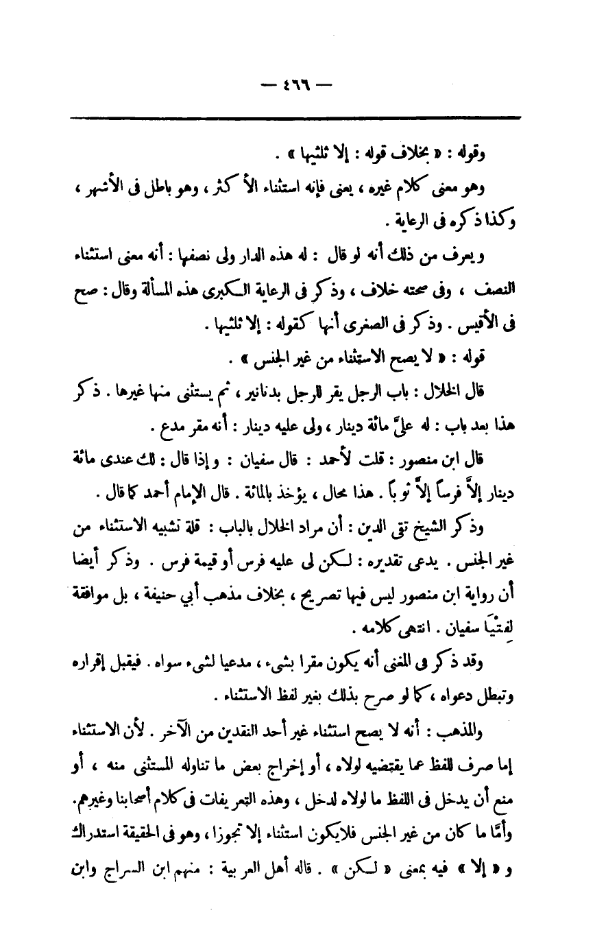 وَذكر الشَّيْخ تَقِيّ الدّين أَن مُرَاد الْخلال بِالْبَابِ قلَّة تَشْبِيه الِاسْتِثْنَاء من غير الْجِنْس يدعى تَقْدِيره لَكِن لي عَلَيْهِ فرس أَو قيمَة فرس وَذكر أَيْضا أَن رِوَايَة ابْن مَنْصُور لَيْسَ فِيهَا تَصْرِيح بِخِلَاف مَذْهَب أبي حنيفَة بل مُوَافقَة لفتيا سُفْيَان انْتهى كَلَامه