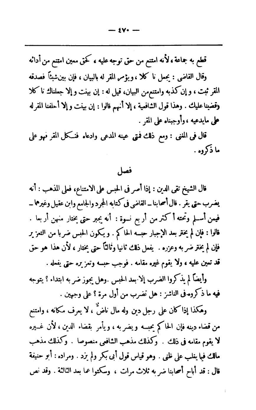 قَالَ الشَّيْخ تَقِيّ الدّين إِذا أصر فِي الْحَبْس على الِامْتِنَاع فعلى الْمَذْهَب أَنه يضْرب حَتَّى يقر قَالَ أَصْحَابنَا القَاضِي فِي كِتَابه الْمُجَرّد وَالْجَامِع وَابْن عقيل وَغَيرهمَا فِيمَن أسلم وَتَحْته أَكثر من أَربع نسْوَة أَنه يجْبر حَتَّى يخْتَار مِنْهُنَّ أَرْبعا قَالُوا فَإِن لم يخْتَر بعد الْإِجْبَار حَبسه الْحَاكِم وَيكون الْحَبْس ضربا من التعزيز فَإِن لم يخْتَر ضربه وعزره يفعل ذَلِك ثَانِيًا وثالثا حَتَّى يخْتَار لِأَن هَذَا هُوَ حق قد تعين عَلَيْهِ وَلَا يقوم غَيره مقَامه فَوَجَبَ حَبسه وتعزيزه حَتَّى يَفْعَله