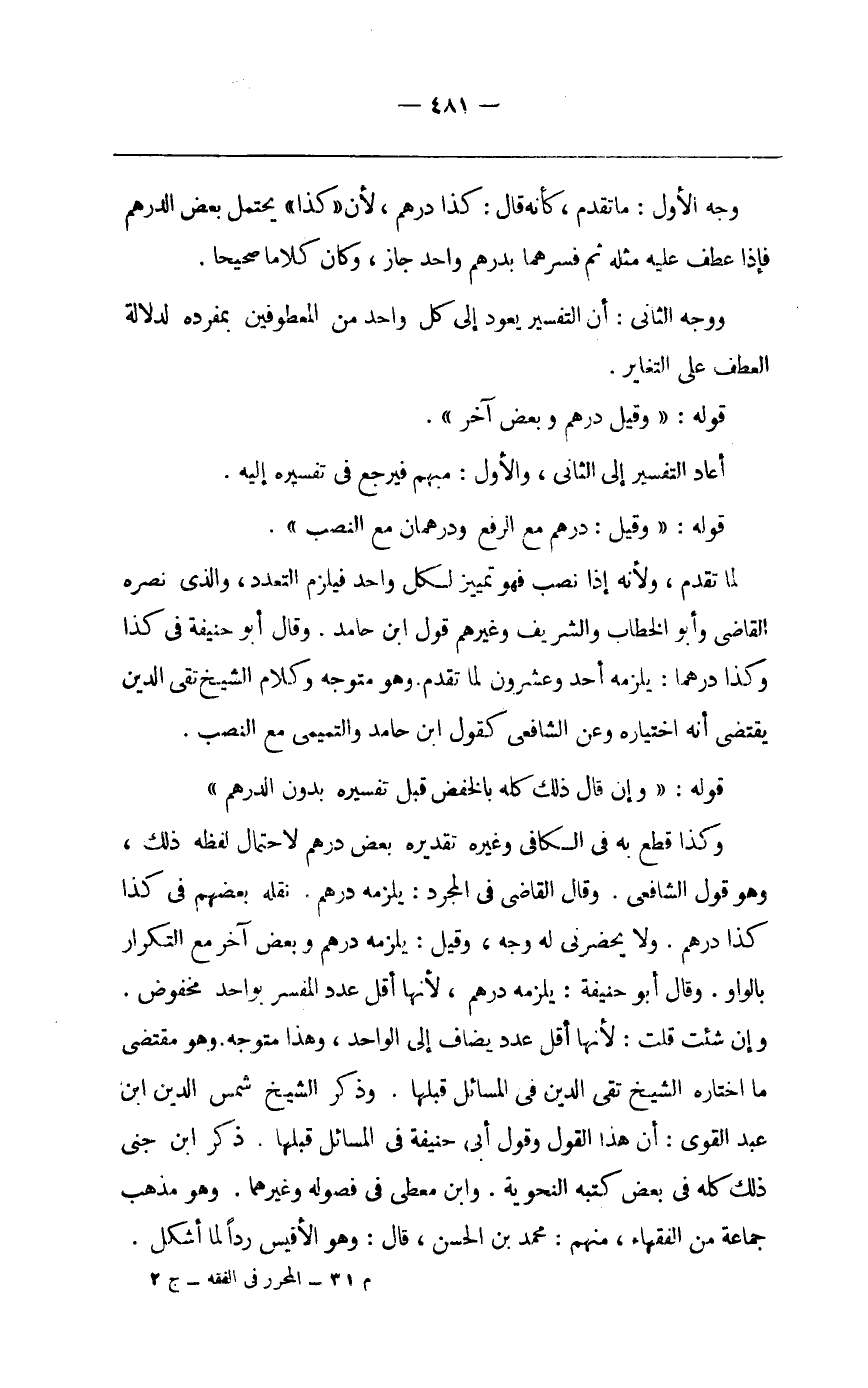وَكَذَا قطع بِهِ فِي الْكَافِي وَغَيره تَقْدِيره بعض دِرْهَم لاحْتِمَال لَفظه ذَلِك وَهُوَ قَول الشَّافِعِي وَقَالَ القَاضِي فِي الْمُجَرّد يلْزمه دِرْهَم نَقله بَعضهم فِي كَذَا كَذَا دِرْهَم وَلَا يحضرني لَهُ وَجه وَقيل يلْزمه دِرْهَم وَبَعض آخر مَعَ التّكْرَار بِالْوَاو وَقَالَ أَبُو حنيفَة يلْزمه دِرْهَم لِأَنَّهَا أقل عدد الْمُفَسّر بِوَاحِد مخفوض وَإِن شِئْت قلت لِأَنَّهَا أقل عدد يُضَاف إِلَى الْوَاحِد وَهَذَا مُتَوَجّه وَهُوَ مُقْتَضى مَا اخْتَارَهُ الشَّيْخ تَقِيّ الدّين فِي الْمسَائِل قبلهَا وَذكر الشَّيْخ شمس الدّين ابْن عبد الْقوي أَن هَذَا القَوْل وَقَول أبي حنيفَة فِي الْمسَائِل قبلهَا ذكر ابْن جنى ذَلِك كُله فِي بعض كتبه النحوية وَابْن معطى فِي فصوله وَغَيرهمَا وَهُوَ مَذْهَب جمَاعَة من الْفُقَهَاء مِنْهُم مُحَمَّد بن الْحسن قَالَ وَهُوَ الأقيس ردا لما أشكل