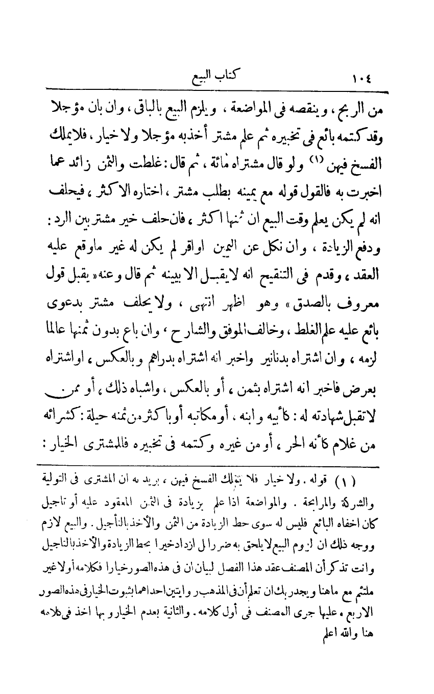 1 قوله ولا خيار فلا يملك الفسخ فيهن، يريد به أن المشتري في التولية والشركة والمرابحة. والمواضعة إذا علم بزيادة في الثمن المعقود عليه أو تأجيل كان أخفاه البائع فليس له سوى حط الزيادة من الثمن والأخذ بالتأجيل. والبيع لازم ووجه ذلك أن لزوم البيع لا يلحق به ضرر بل ازداد خيرا بحط الزيادة والأخذ بالتأجيل وأنت تذكر أن المصنف عقد هذا الفصل لبيان في هذه الصورة خيارا فكلامه أو لا غير ملتئم مع ما هنا ويجدر بك أن تعلم أن في المذهب روايتين إحداهما بثبوت الخيار في هذه الصور الأربع، عليها جرى المصنف في أول كلامه. والثانية بعدم الخيار وبها أخذ في كلامه هنا والله أعلم.