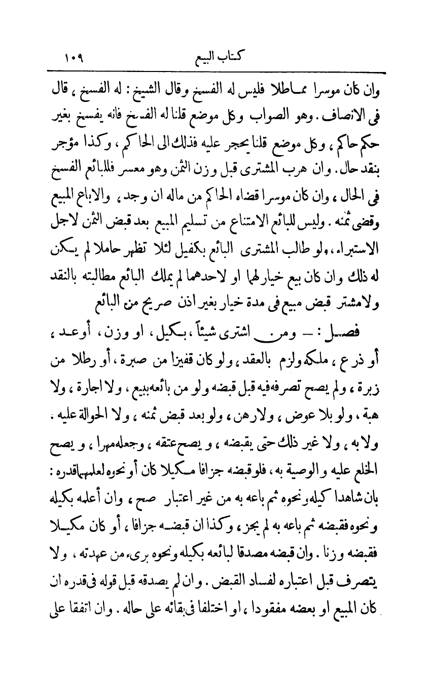 وإن كان موسرا مماطلا فليس له الفسخ وقال الشيخ: له الفسخ قال في الإنصاف وهو الصواب وكل موضع قلنا له الفسخ فإنه يفسخ بغير حكم حاكم وكل موضع قلنا يحجر عليه فذلك إلى الحاكم وكذا مؤجر بنقد حال وإن هرب المشتري قبل وزن الثمن وهو معسر فللبائع الفسخ في الحال وإن كان موسرا قضاه الحاكم من ماله إن وجد وإلا باع المبيع وقضى ثمنه وليس للبائع الامتناع من تسليم المبيع بعد قبض الثمن لأجل الاستبراء ولو طالب المشتري البائع بكفيل لئلا تظهر حاملا لم يكن له ذلك وإن كان بيع خيار لهما أو لأحدهما لم يملك البائع مطالبته بالنقد ولا مشتر قبض مبيع في مدة خيار بغير إذن صريح من البائع.