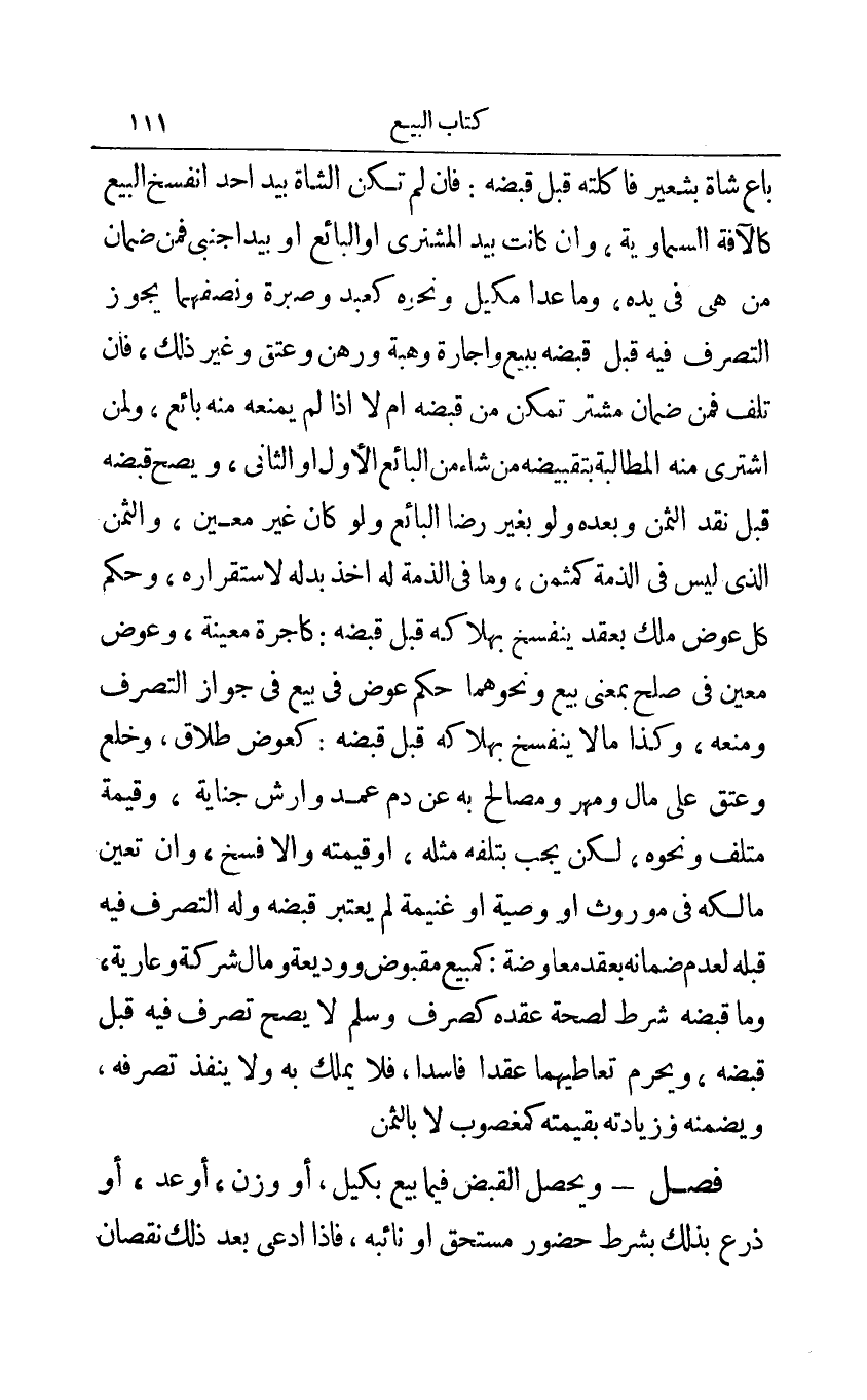 باع شاة بشعير فأكلته قبل قبضه: فإن لم تكن الشاة بيد أحد انفسخ البيع كالآفة السماوية وإن كانت بيد المشتري أو البائع أو بيد أجنبي فمن ضمان من هي في يده وما عدا مكيل ونحوه كعبد وصبرة ونصفهما يجوز التصرف فيه قبل قبضه ببيع وإجارة وهبة ورهن وعتق وغير ذلك فإن تلف فمن ضمان مشتر تمكن من قبضه أم لا إذا لم يمنعه منه بائع ولمن اشترى منه المطالبة بتقبيضه من شاء من البائع الأول أو الثاني ويصح قبضه قبل نقد الثمن وبعده ولو بغير رضا البائع ولو كان غير معين والثمن الذي ليس في الذمة كثمن وما في الذمة له أخذ بدله لاستقراره وحكم كل عوض ملك بعقد ينفسخ بهلاكه قبل قبضه: كأجرة معينة وعوض معين في صلح بمعنى بيع ونحوهما حكم عوض في بيع في جواز التصرف ومنعه وكذا ما لا ينفسخ بهلاكه قبل قبضه: كعوض طلاق وخلع وعتق على مال ومهر ومصالح به عن دم عمد وأرش جناية وقيمة متلف ونحوه لكن يجب بتلفه مثله أو قيمته وإلا فسخ وإن تعين مالكه في مورث أو وصية أو غنيمة لم يعتبر قبضه وله التصرف فيه قبله لعدم ضمانه بعقد معاوضة: كمبيع مقبوض ووديعة ومال شركة وعارية وما قبضه شرط لصحة عقده كصرف وسلم لا يصح تصرف فيه قبل قبضه ويحرم تعاطيهما عقدا فاسدا فلا يملك به ولا ينفذ تصرفه ويضمنه وزيادته بقيمته كمغصوب لا بالثمن.
