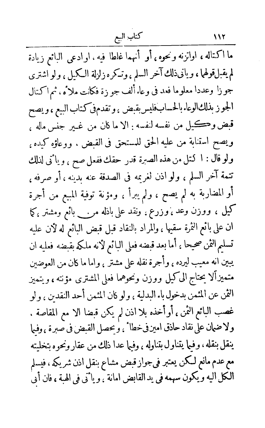 أو وزن أو عد أو ذرع بذلك بشرط حضور مستحق او نائبه فإذا ادعى بعد ذلك نقصان ما اكتاله أو اتزانه ونحوه أو أنهما غلطا فيه أو ادعى البائع زيادة لم يقبل قولهما ويأتي ذلك آخر السلم وتكره زلزلة الكيل ولو اشترى جوزا وعددا معلوما فعد في وعاء ألف جوزة فكانت ملأه ثم اكتال الجواز بذلك الوعاء بالحساب فليس بقبض وتقدم في كتاب البيع ويصح قبض وكيل من نفسه لنفسه إلا ما كان من غير جنس ماله ويصح استنابة من عليه الحق للمستحق في القبض ووعاؤه كيده ولو قال: اكتل من هذه الصبرة قدر حقك ففعل صح ويأتي لذلك تتمة آخر السلم ولو إذن لغريمه في الصدقة عند بدينه أو صرفه أو المضاربة به لم يصح ولم يبرأ ومؤنة توفية المبيع من أجرة كيل ووزن وعد وزرع ونقد على باذله من بائع ومشتر كما أن على بائع الثمرة سقيها والمراد بالنقاد بل قبض البائع له لأن عليه تسليم الثمن صحيحا أما بعد قبضه فعلى البائع لأنه ملكه بقبضه فعليه أن يبين أنه معيب ليرده وأجرة نقله على مشتر وأما ما كان من العوضين متميزا لا يحتاج إلى كيل ووزن ونحوهما فعلى المشتري مؤنته ويتميز الثمن عن المثمن بدخول باء البديلة ولو كان المثمن أحد النقدين ولو غصب البائع الثمن أو أخذه بلا إذن لم يكن قبضا إلا مع المقاصة ولا ضمان على نقاد حاذق أمين في خطأ ويحصل القبض في صبرة وفيما ينقل بنقله وفيما يتناول بتناوله وفيما عدا ذلك من عقار ونحوه بتخليته مع عدم مانع لكن يعتبر في جواز قبض مشاع بنقل إذن شريكه فيسلم الكل إليه ويكون سهمه في يد القابض أمانة ويأتي في الهبة فإن أبى