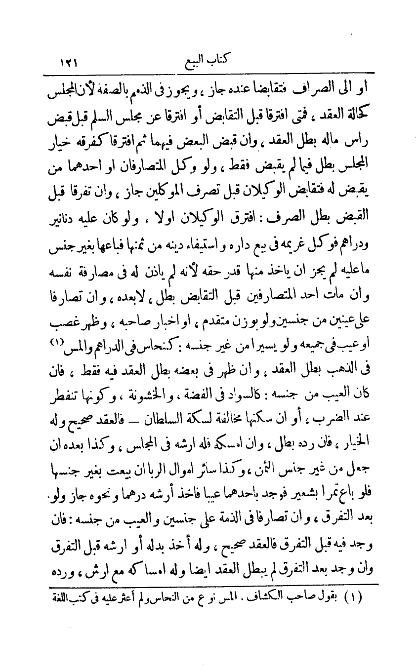 وهي بيع نقد بنقد والقبض في المجلس شرط لصحته فإن طال المجلس أو تماشيا مصطحبين إلى منزل أحدهما أو إلى الصراف فتقابضا عنده جاز ويجوز في الذمم بالصفة لأن المجلس كحالة العقد فمتى افترقا قبل التقابض أو افترقا عن مجلس السلم قبل قبض رأس ماله بطل العقد وإن قبض البعض فيهما ثم افترقا كفرقه خيار المجلس بطل فيما لم يقبض فقط ولو وكل المتصارفان أو أحدهما من يقبض له فتقابض الوكيلان قبل تصرف الموكلين جاز وإن تفرقا قبل القبض بطل الصرف: افترق الوكيلان أولا ولو كان عليه دنانير ودراهم فوكل غريمه في بيع داره واستيفاء دينه من ثمنها فباعها بغير جنس ما عليه لم يجز أن يأخذ منها قدر حقه لأنه لم يأذن له في مصارفة نفسه وإن مات أحد المتصارفين قبل التقابض بطل لا بعده وإن تصارفا على عينين من جنسين ولو بوزن متقدم أو أخبار صاحبه وظهر غصب أو عيب في جميعه ولو يسيرا من غير جنسه: كنحاس في الدراهم والمس1 في الذهب بطل العقد وإن ظهر في بعضه بطل العقد فيه فقط فإن كان العيب من جنسه: كالسواد في الفضة الخشونة وكونها تنفطر عند الضرب أو أن سكنها مخالفة لسكة السلطان - فالعقد صحيح وله الخيار فإن رده بطل وإن أمسكه فله أرشه في المجلس وكذا بعده أن جعل من غير جنس الثمن وكذا سائر أموال الربا أن بيعت بغير جنسها فلو باع تمرا بشعير فوجد بأحدهما عيبا فأخذ أرشه درهما ونحوه جاز ولو بعد التفرق وإن تصارفا في الذمة على جنسين والعيب من جنسه: فإن وجد فيه قبل التفرق فالعقد صحيح وله أخذ بدله أو أرشه قبل التفرق وإن وجد بعد التفرق لم يبطل العقد أيضا وله إمساكه مع أرش ورده