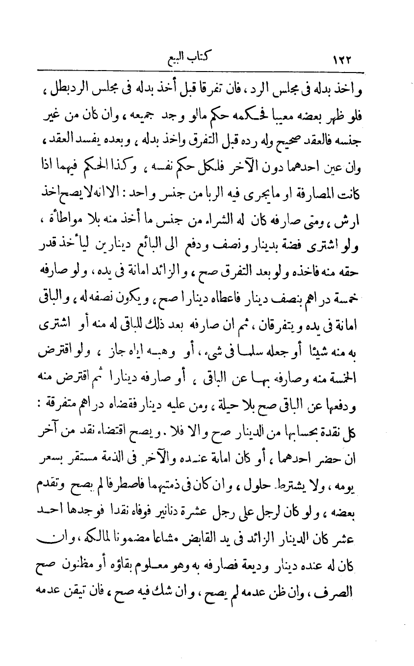 وأخذ بدله في مجلس الرد فإن تفرقا قبل اخذ بدله في مجلس الرد بطل فلو ظهر بعضه معيبا فحكمه ما لو وجد جميعه وإن كان من غير جنسه فالعقد صحيح وله رده قبل التفرق وأخذ بدله وبعده يفسد العقد وإن عين أحدهما دون الآخر فلكل حكم نفسه وكذا الحكم فيهما إذا كانت المصارفة أو ما يجري فيه الربا من جنس واحد: إلا أنه لا يصح أخذ أرش ومتى فضة بدينار ونصف ودفع إلى البائع دينارين ليأخذ قدر حقه منه فأخذه ولو بعد التفرق صح والزائد أمانة في يده ولو صارفه خمسة دراهم بنصف دينار فأعطاه دينارا صح ويكون نصفه له والباقي أمانة في يده ويتفرقان ثم أن صارفه بعد ذلك للباقي له منه أو اشترى به منه شيئا أو جعله سلما في شيء أو وهبه إياه جاز ولو اقترض الخمسة منه وصارفه بها عن الباقي أو صارفه دينارا ثم اقترض منه ودفعها عن الباقي صح بلا حيلة ومن عليه دينار فقضاه دراهم متفرقة: كل نقدة بحسابها من الدينار صح وإلا فلا ويصح اقتضاء نقد من آخر أن حضر أحدهما أو كان أمانة عنده والآخر في الذمة مستقر بسعر يومه ولا يشترط حلول وإن كان في ذمتيهما فاصطرفا لم يصح وتقدم بعضه ولو كان لرجل على رجل عشرة دنانير فوفاه نقدا فوجدها أحد عشر كان الدينار الزائد في يد القابض مشاعا مضمونا لمالكه وإن كان له عنده دينار وديعة فصارفه به وهو معلوم بقاؤه أو مظنون صح الصرف وإن ظن عدمه لم يصح وإن شك فيه صح فإن تيقن عدمه