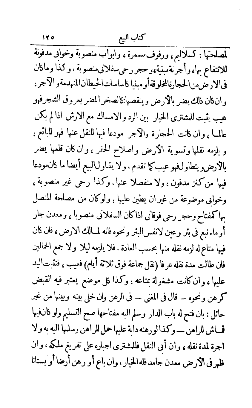 لمصلحتها: كسلاليم ورفوق مسمرة وأبواب منصوبة وخوابي مدفونة للانتفاع بها وأجرنة مبنية وحجر رحى سفلاني منصوبة وكذا وما كان في الأرض من الحجارة المخلوقة أو مبنيا كأساسات الحيطان المنهدمة والآجر وإن كان ذلك يضر بالأرض وينقصها: كالصخر المضر بعروق الشجر فهو عيب يثبت للمشتري الخيار بين الرد والإمساك مع الأرش إذا لم يكن عالما وإن كان الحجارة والآجر مودعا فيها للنقل عنها فهو للبائع ويلزمه نقلها وتسوية الأرض وإصلاح الحفر وإن كان قلعها يضر بالأرض ويتطاول فهو عيب كما تقدم ولا يتناول البيع أيضا ما كان مودعا فيها من كنز مدفون ولا منفصلا عنها وكذا رحى غير منصوبة وخوابي موضوعة من غير أن يطين عليها ولو كان من مصلحة المتصل بها كمفتاح وحجر رحى فوقاني إذا كان السفلاني منصوبا ومعدن جار أو ماء نبع في بئر وعين لا نفس البئر ونحوه فإنه لمالك الأرض فإن كان فيها متاع له لزمه نقله منها بحسب العادة فلا يلزمه ليلا ولا جمع الحمالين فإن طالت مدة نقله عرفا نقل جماعة فوق ثلاثة أيام فعيب فتثبت اليد عليها وإن كانت مشغولة بمتاعة وكذا كل موضع يعتبر فتثبت اليد عليها وإن كانت مشغولة بمتاعة وكذا كل موضع يعتبر فيه القبض كرهن ونحوه - قال في المغني - في الرهن وإن خلى بينه وبينها من غير حائل: بان فتح له باب الدار وسلم إليه مفتاحها صح التسليم ولو كان فيها قماش للراهن - وكذا لو رهنه دابة عليها حمل للراهن وسلمها إليه به ولا أجرة لمدة نقله وإن أبى النقل فللمشتري إجباره على تفريغ ملكه وإن ظهر في الأرض معدن جامد فله الخيار وإن باع أو رهن أرضا أو بستانا