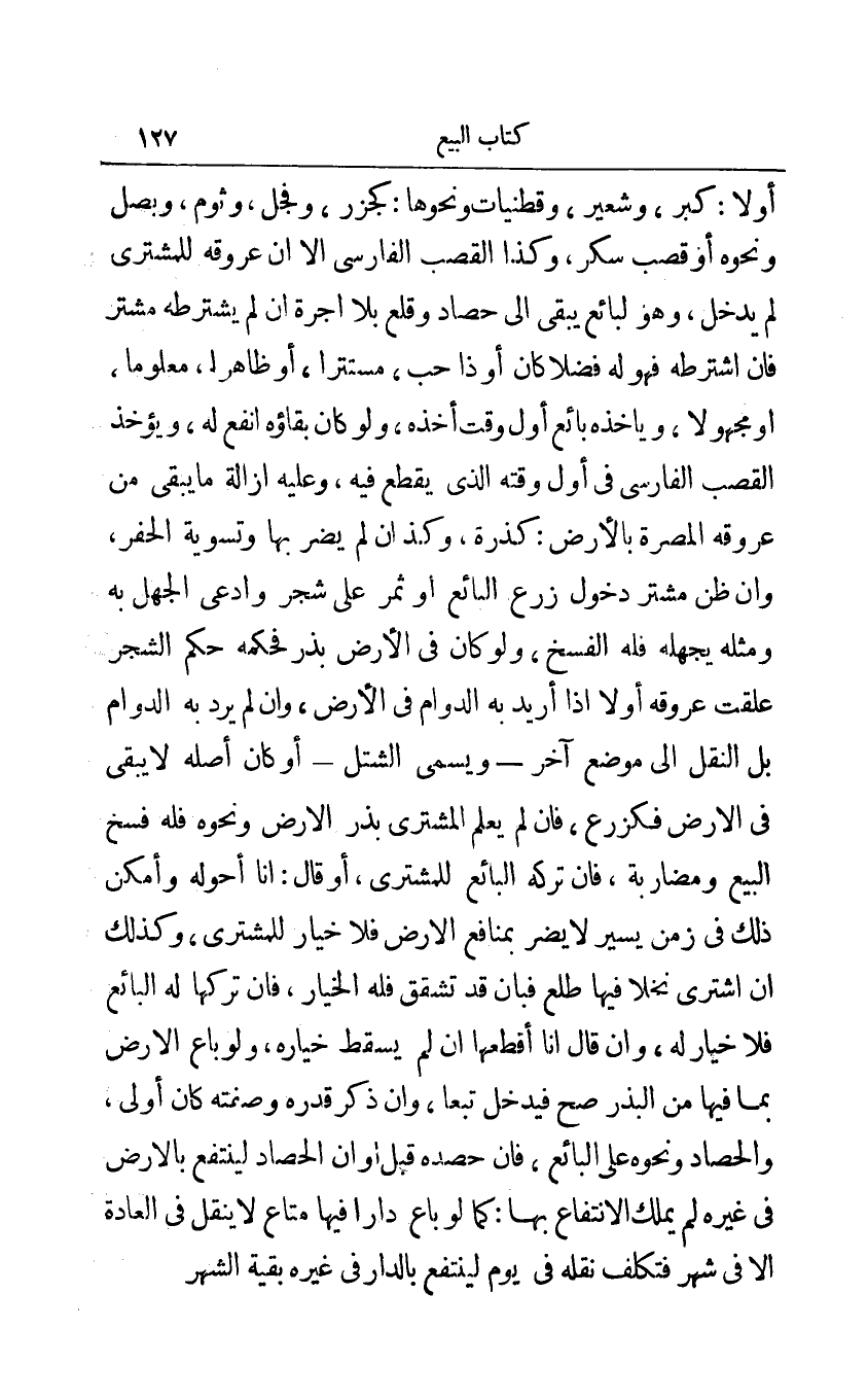 أولا: كبر وشعير وقطنيات ونحوها: كجزر وفجل وثوم وبصل ونحوه أو قصب سكر وكذا القصب الفارسي إلا أن عروقه للمشتري لم يدخل وهو لبائع يبقى إلى حصاد وقلع بلا أجرة إن لم يشترطه مشتر فإن اشترطه فهو له فضلا كان أو ذا حب مستترا أو ظاهرا معلوما أو مجهولا ويأخذه بائع أول وقت أخذه ولو كان بقاؤه انفع له ويؤخذ القصب الفارسي في أول وقته الذي يقطع فيه وعليه إزالة ما يبقى من عروقه المصرة بالأرض كذرة وكذا إن لم يضر بها وتسوية الحفر وإن ظن مشتر دخول زرع البائع أو ثمر على شجر وأدعى الجهل به ومثله يجهله فله الفسخ ولو كان في الأرض بذر فحكمه حكم الشجر علقت عروقه أولا إذا أريد به الدوام في الأرض وإن لم يرد به الدوام بل النقل إلى موضع آخر - ويسمى الشتل - أو كان أصله لا يبقى في الأرض فكزرع فإن لم يعلم المشتري بذر الأرض ونحوه فله فسخ البيع ومضاربة فإن تركه البائع للمشتري أو قال: أنا أحوله وأمكن ذلك في زمن يسير لا يضر بمنافع الأرض فلا خيار للمشتري وكذلك إن اشترى نخلا فيها طلع فبان قد تشقق فله الخيار فإن تركها له البائع فلا خيار له وإن قال أنا أقطعها إن لم يسقط خياره ولو باع الأرض بما فيها من البذر صح فيدخل تبعا وإن ذكره قدره وصفته كان أولى والحصاد ونحوه على البائع فإن حصده قبل أو أن الحصاد لينتفع بالأرض في غيره لم يملك الانتفاع بها: كما لو باع دارا فيها متاع لا ينقل في العادة إلا في شهر فتكلف نقله في يوم لينتفع بالدار في غيره بقية الشهر.