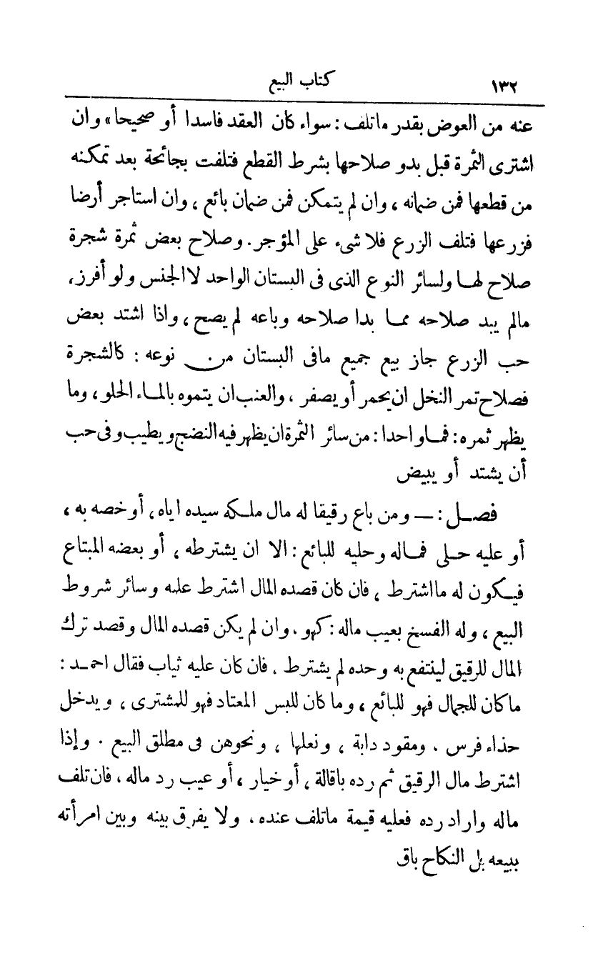 ملكه سيده إياه أو خصه به أو عليه حلى فماله وحليه للبائع: إلا أن يشترطه أو بعضه المبتاع فيكون به ما اشترط فإن كان قصده المال اشترط عليه وسائر شروط البيع وله الفسخ بعيب ماله كهو وإن لم يكن قصده المال وقصد ترك المال للرقيق لينتفع به وحده لم يشترط فإن كان عليه ثياب فقال أحمد: ما كان للجمال فهو للبائع وما كان للبس المعتاد فهو للمشتري ويدخل حذاء الفرس ومقود دابة ونعلها ونحوهن في مطلق البيع وإذا اشترط مال الرقيق ثم رده بإقالة أو خيار أو عيب رد ماله فإن تلف ماله وأراد رده فعليه ما تلف عنده ولا يفرق بينه وبين امرأته ببيعه بل النكاح باق.