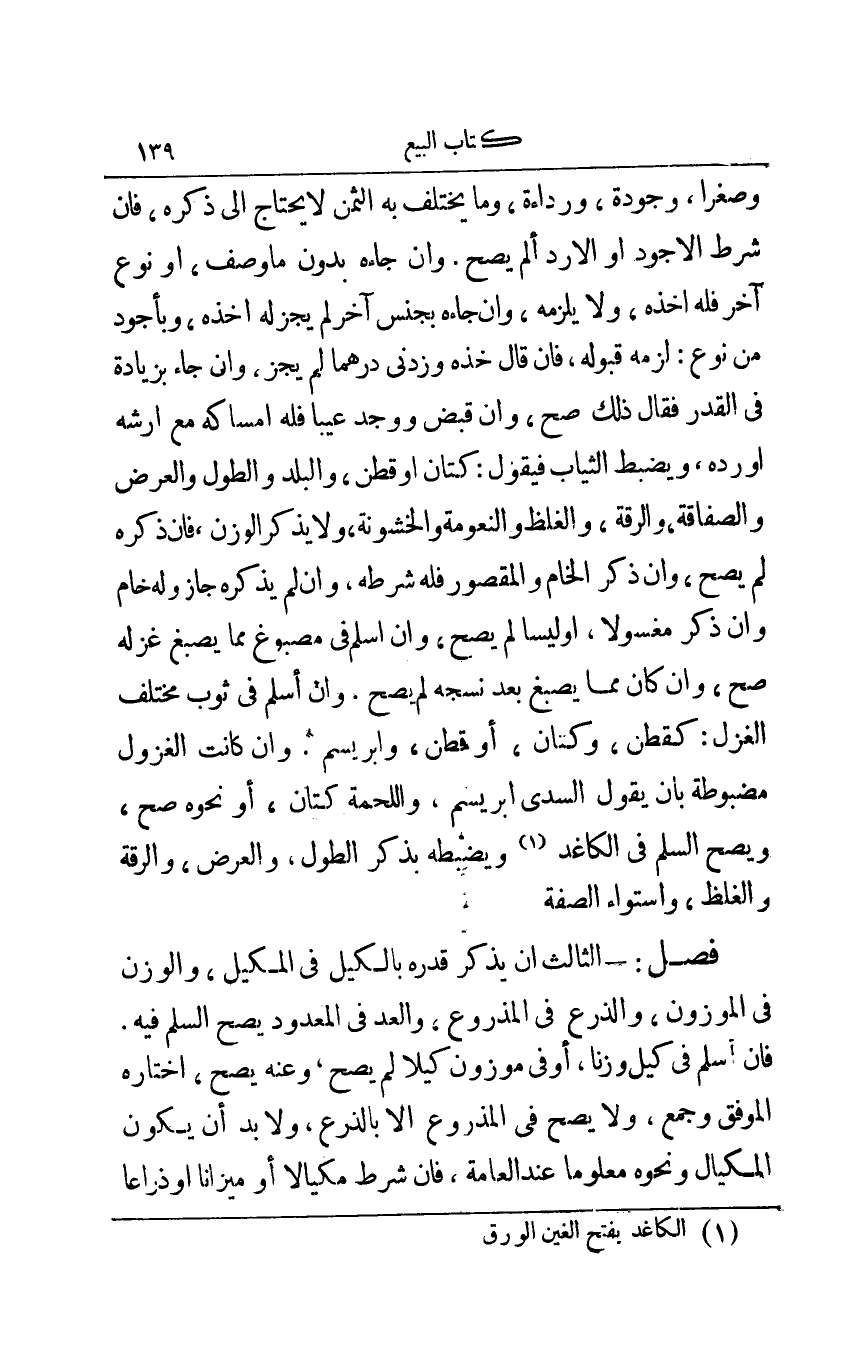 وصغرا وجودة ورداءة وما يختلف به الثمن لا يحتاج إلى ذكره فإن شرط الأجود أو الأردأ لم يصح وإن جاءه بدون ما وصف أو نوع آخر فله أخذه ولا يلزمه وإن جاءه بجنس آخر لم يجز له أخذه وبأجود من نوع: لزمه قبوله فإن قال خذه وزدني درهما لم يجز وإن جاء بزيادة في القدر فقال ذلك صح وإن قبض ووجد عيبا فله إمساكه مع أرشه أو رده ويضبط الثياب فيقول: كتان أو قطن والبلد والطول والعرض والصفاقة والرقة والغلظ والنعومة والخشونة ولا يذكر الوزن فإن ذكره لم يصح وإن ذكر الخام والمقصور فله شرطه وإن لم يذكره جاز وله خام وإن ذكر مغسولا أو ليسا لم يصح وإن أسلم في ثوب مختلف الغزل: كقطن وكتان أو قطن ابريسم وإن كانت الغزول مضبوطة بأن يقول السدي ابريسم واللحمة كتان أو نحوه صح ويصح السلم في الكاغد1 ويضبطه بذكر الطول والعرض والرقة والغلظ واستواءء الصفة.