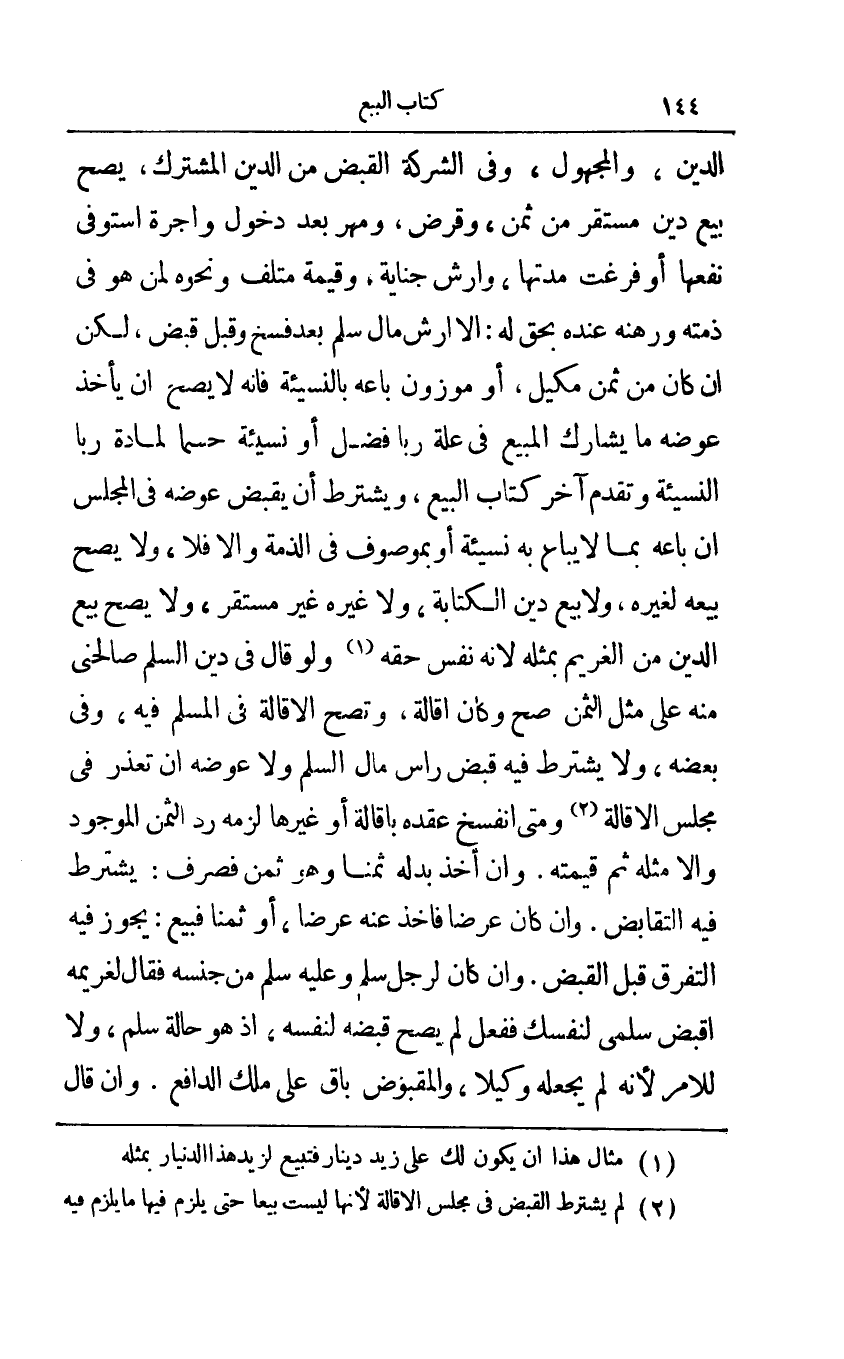 الدين والمجهول وفي الشركة القبض من الدين المشترك يصح بيع دين مستقر من ثمن وقرض ومهر بعد دخول وأجرة استوفى نفعها أو فرغت مدتها وأرش جناية وقيمة متلف ونحوه لمن هو في ذمته ورهنه عنده بحق له: إلا أرش مال سلم بعد فسخ وقبل قبض لكن إن كان من ثمن مكيل أوموزون باعه النسيئة فإنه لا يصح أن يأخذ عوضه ما يشارك المبيع في علة ربا فضل أو نسيئة حسما لمادة ربا النسيئة وتقدم آخر كتاب البيع ويشترط أن يقبض عوضه في المجلس أن باعه بما لا بياع به نسيئة أو بموصوف في الذمة وإلا فلا ولا يصح بيعه لغيره ولا بيع دين الكتابة ولا غيره غير مستقر ولا يصح بيع الدين من الغريم بمثله لأنه نفس حقه1 ولو قال في دين السلم صالحني منه على مثل الثمن صح وكان إقالة وتصح الإقالة في المسلم فيه وفي بعضه ولا يشترط فيه قبض رأس مال السلم ولا عوضه إن تعذر في مجلس الإقالة2 ومتى انفسخ عقده بإقالة أو غيرها لزمه رد الثمن الموجود وإلا مثله ثم قيمته وإن أخذ بدله ثمنا وهو ثمن فصرف: يشترط فيه التقابض وإن كان عرضا فأخذ عنه عرضا أو ثمنا فبيع: يجوز فيه التفرق قبل القبض وإن كان لرجل سلم وعليه سلم من جنسه فقال لغريمه اقبض سلمي لنفسك ففعل لم يصح قبضه لنفسه إذ هو حالة سلم ولا للأمر لأنه لم يجعله وكيلا والمقبوض باق على مالك الدافع وإن قال